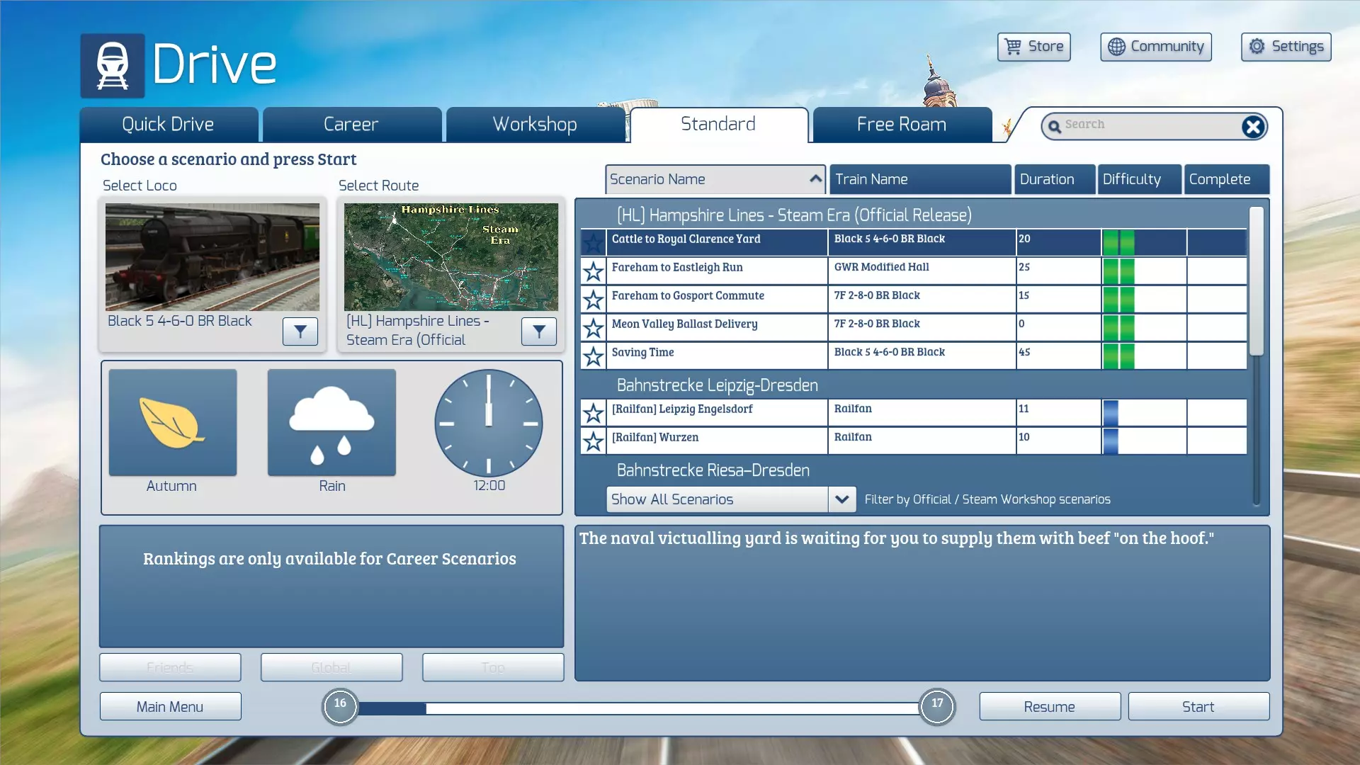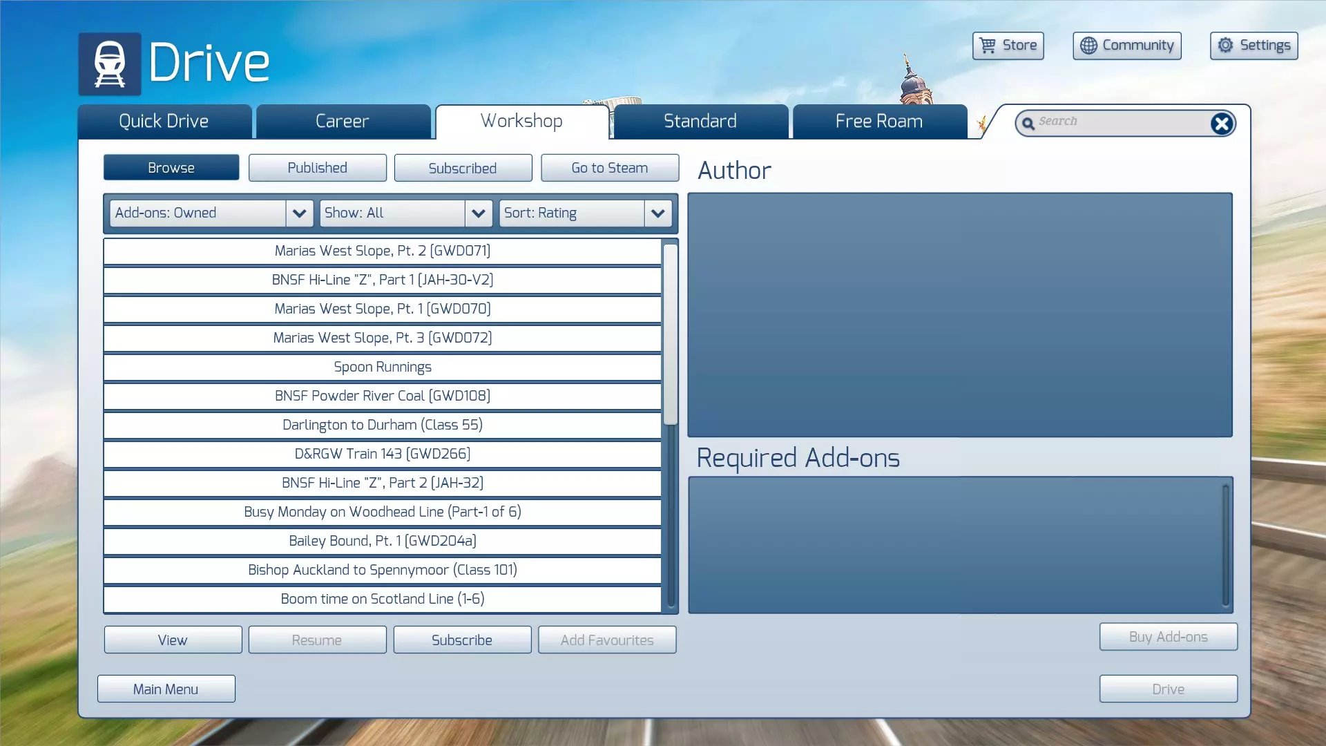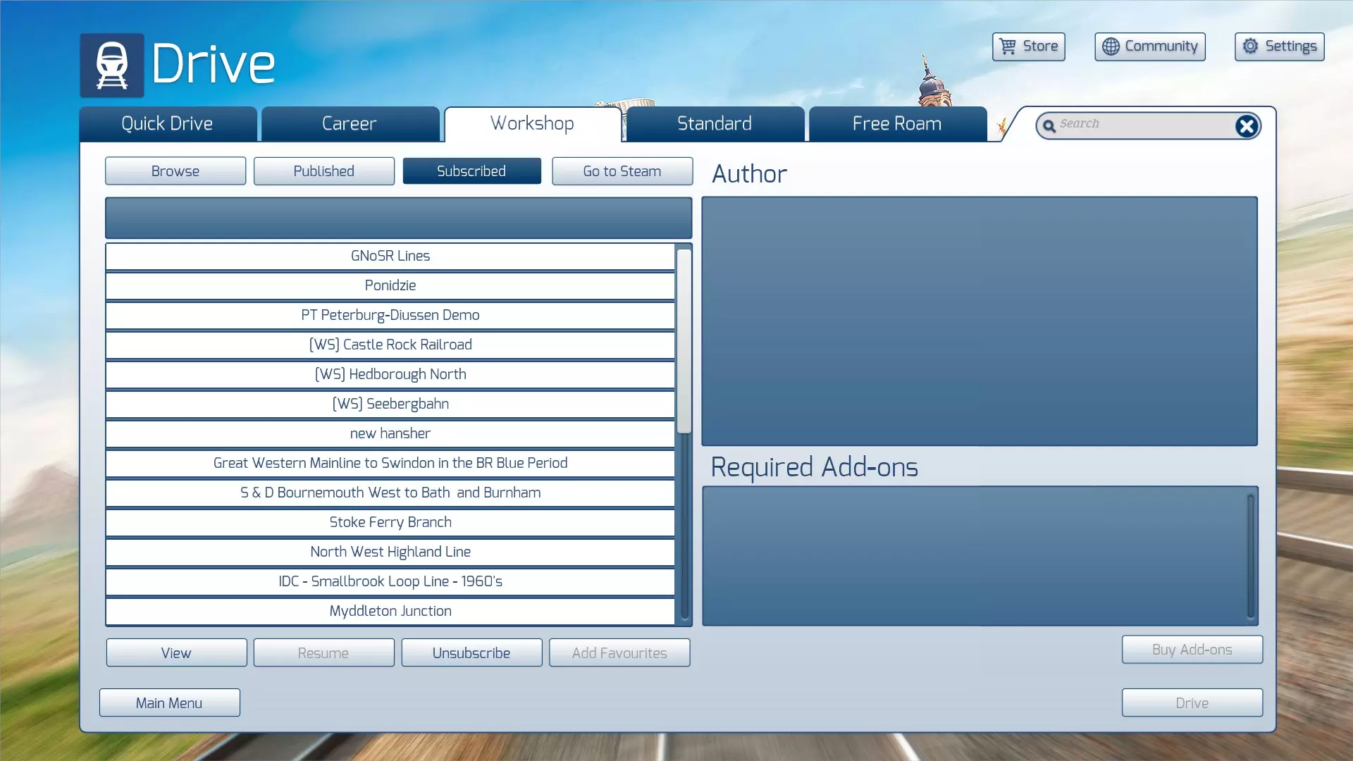 您的新创意工坊项目将随即安装,并且您会看到它已添加至“已订阅”列表中。 现在该项目已准备就绪可供使用。但我们建议您**不要通过此菜单上的“驾驶”按钮运行场景**。我们的建议是遵循下一部分中的说明。 ### 运行场景 如果您新安装的创意工坊项目是一个场景,那么它很可能是一个标准场景。 **建议您通过“标准”标签页而非创意工坊标签页运行场景**。原因是创意工坊标签页菜单下的“驾驶”按钮依赖于工坊的标签系统,若路线或场景被标记了您未拥有的项目,该按钮将被禁用。通常会出现错误的标签,尤其是大都会线的标签。 因此……在“驾驶”菜单中,选择“标准”选项。 你将在其创建时所属的路线下找到新的场景。 点击场景名称进行选择。 按下“开始”键启动场景。