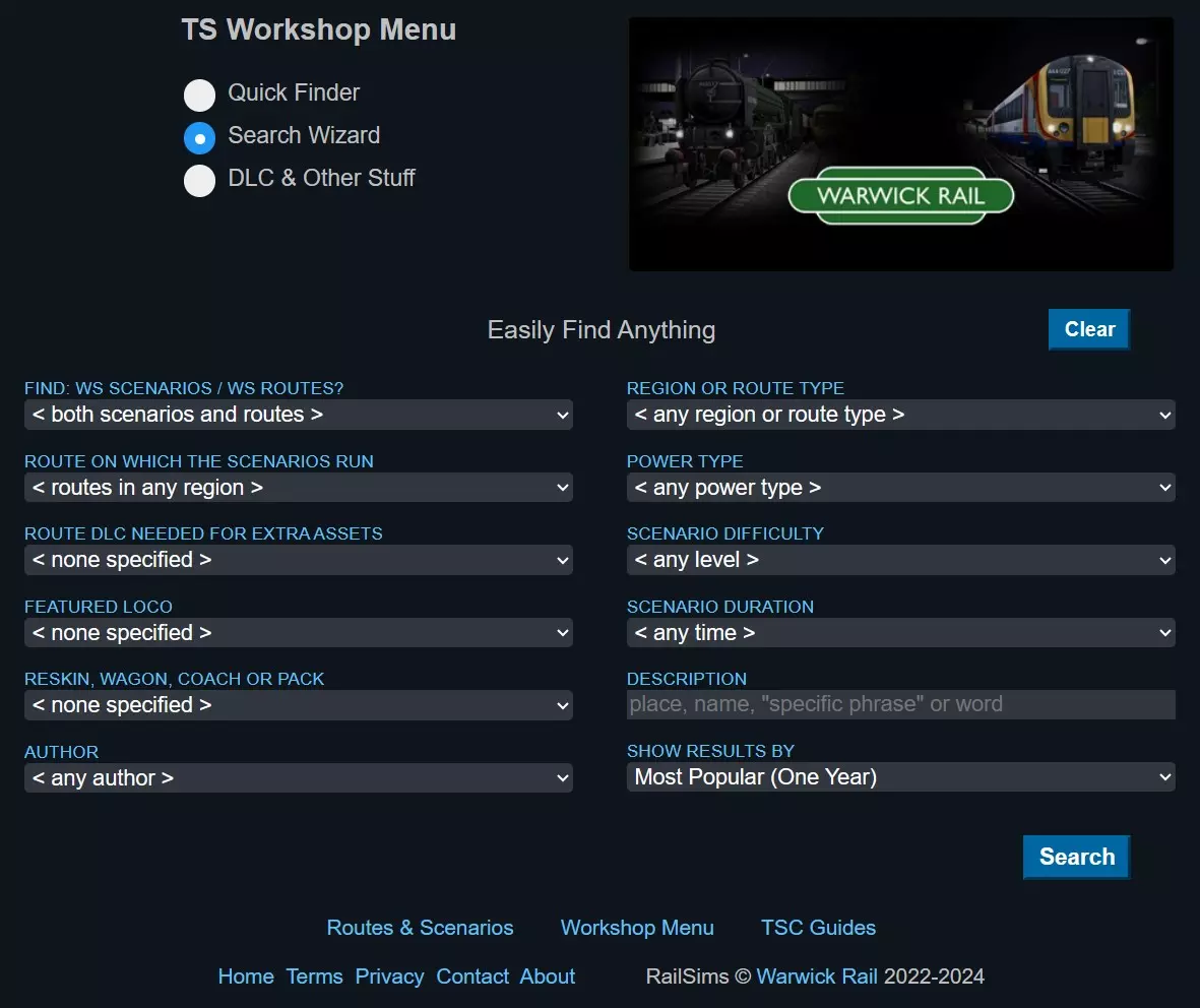 只需选择任意路线,即可立即获取该路线的一系列场景。 查找物品 - 通过搜索向导 查找所需内容最有效的方式是通过高级搜索向导。 您可以通过点击以下链接并从菜单中选择“Search Wizard”来访问它。 TSC 工坊菜单[www.railsims.com]