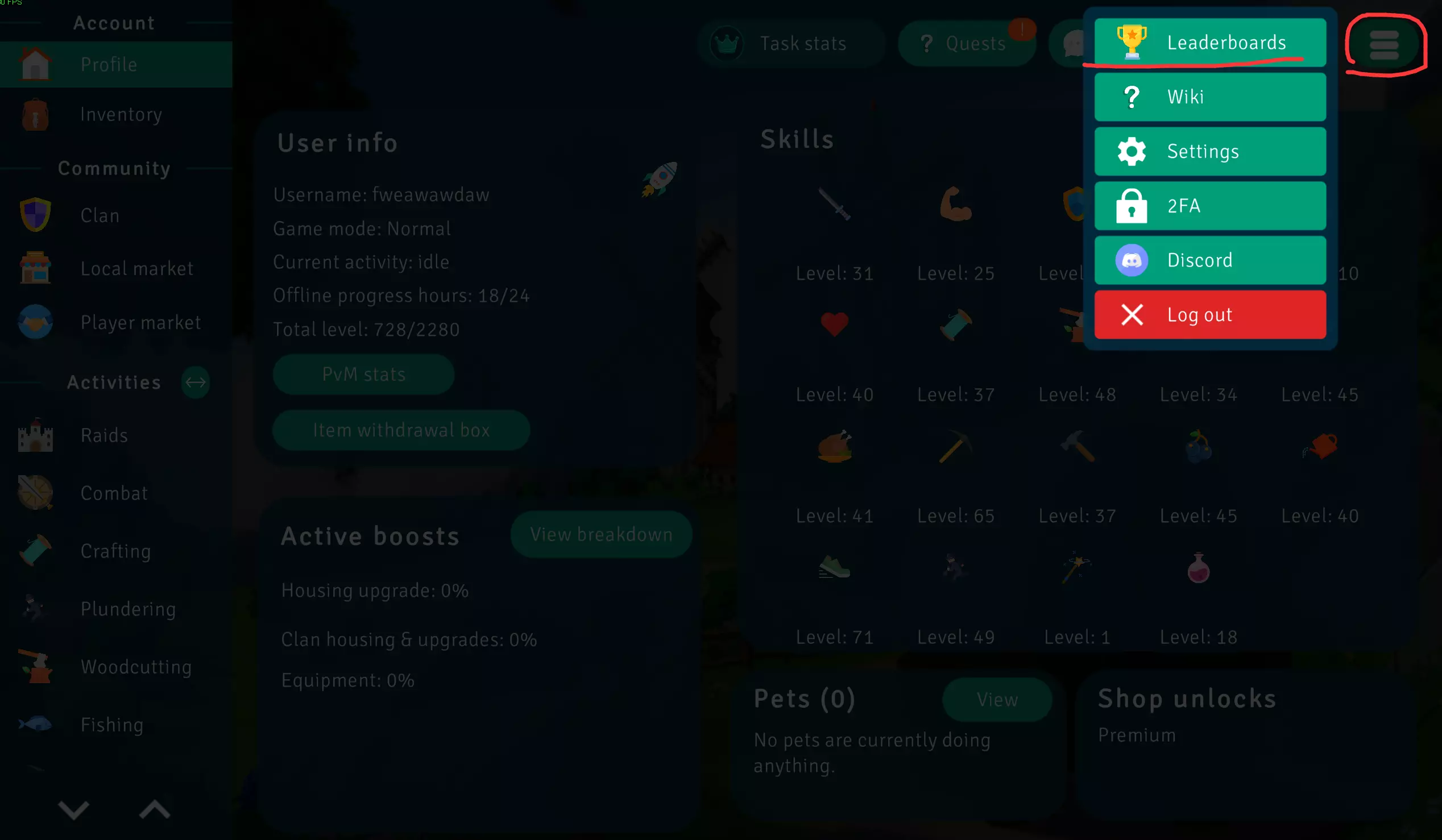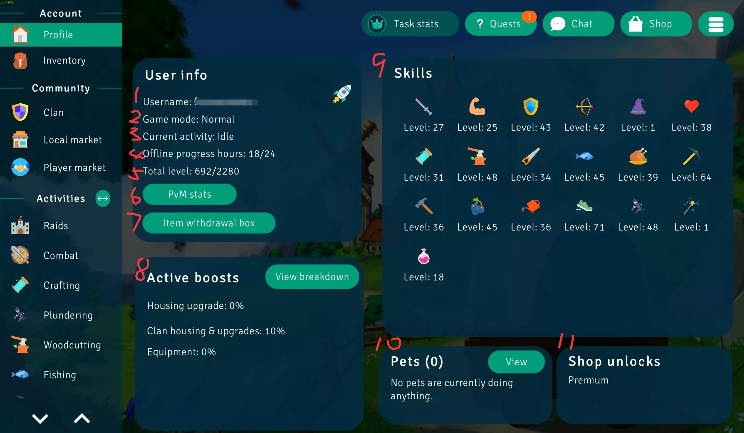 1. 用户名 2. 游戏模式 3. 当前活动 4. 离线进程时间 5. 合计等级(所有技能等级总和) 6. BOSS战统计 7. 物品接收箱(他人赠送的物品将暂存于此) 8. 生效加成 9. 当前各项技能数值 10. 宠物 11. 商店已解锁物品 仓库物品操作说明