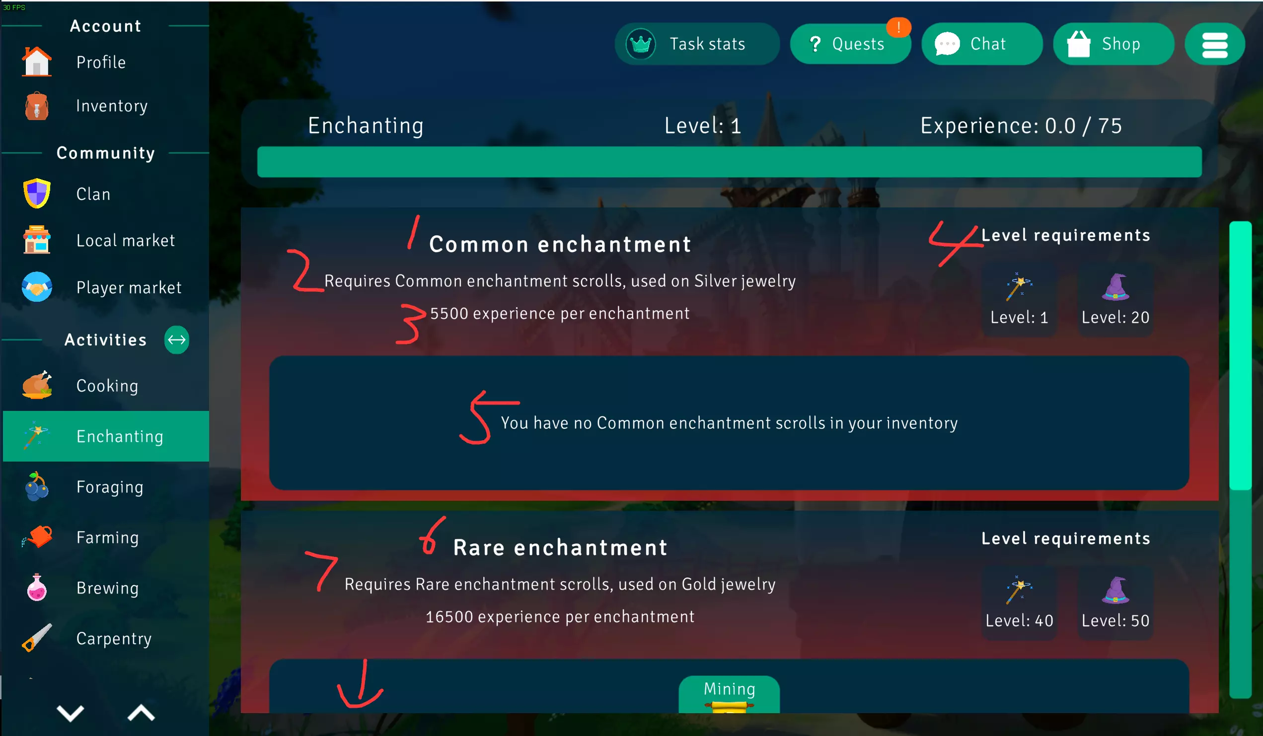 1.普通附魔 2.需要普通品质的附魔卷轴,在银制级珠宝上使用 3.每次附魔提供(数量)的经验 4.等级需求 5.你的仓库中没有普通品质的附魔卷轴 6.稀有附魔 7.需要稀有品质的附魔卷轴,在金制级珠宝上使用 8.卓越附魔 9.需要卓越品质的附魔卷轴,在钻石级珠宝上使用 剩余技能