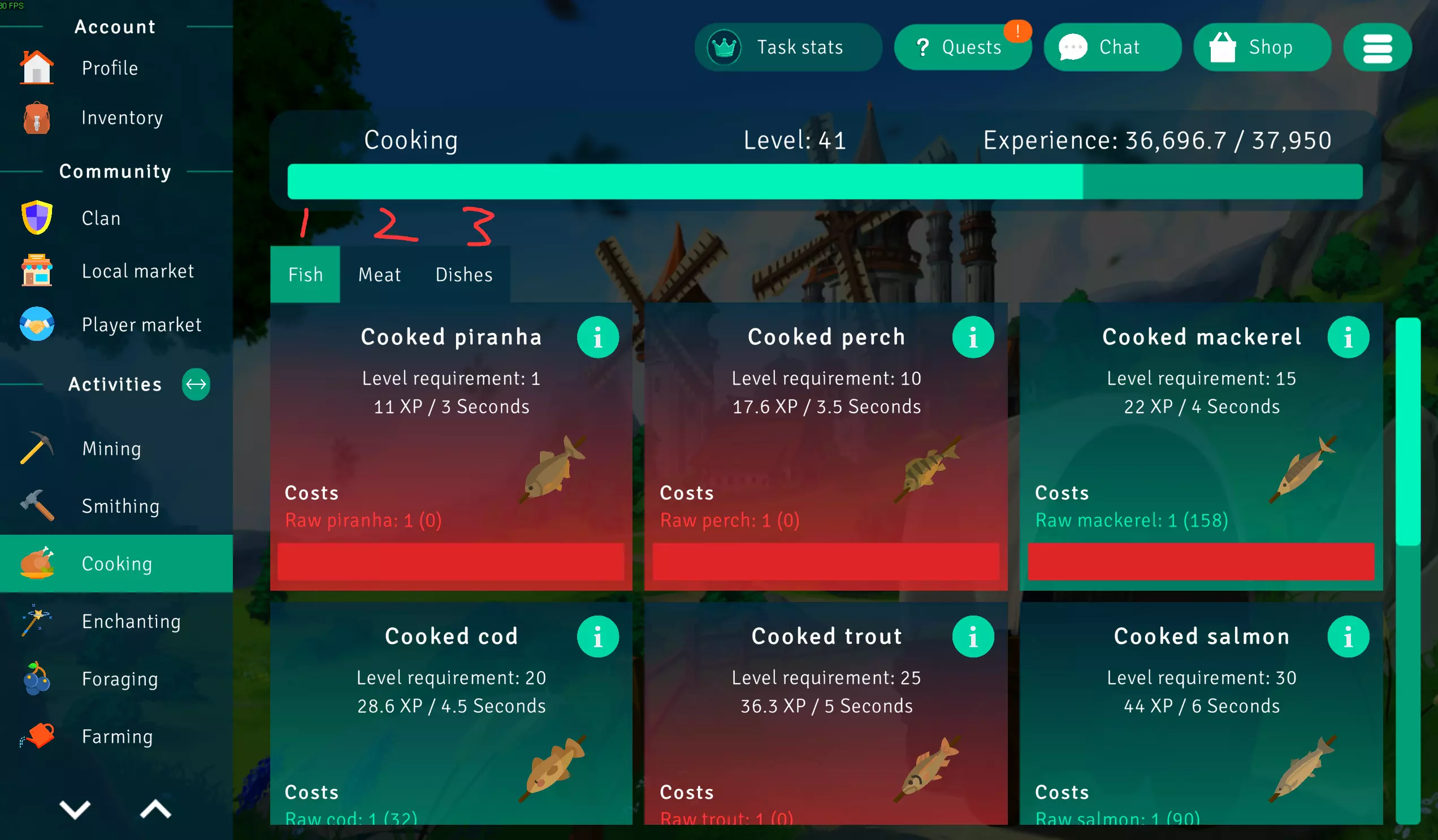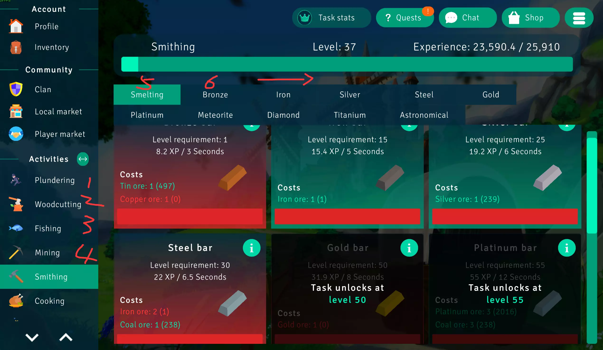 一些暂时不会再用到的(比如低等级的物品)可以卖掉赚点钱。游戏内所有物品都可以用游戏币买到,除了高级代币。也有一些代币很重要,但前期建议都用在升级技能上,比如自动进食(Auto eating)和自动拾取(Auto looting),这会为后面打怪物省很多事。等技能升级得差不多了,再考虑购买剩下的代币。 一定要做每日任务和每周任务,基本上半小时就能获得几万游戏币,非常划算。 成就部分: 我将成就分为两类,一类是堆叠数字或时间的成就,另一类是需要特意完成的成就,一些必得的成就也归在后者中,不再单独分类。 推荐使用 CTRL+F 来搜索自己尚未解锁的成就。一些需要高级代币才能获得的成就在这里就不一一提及了,可以查看前面的章节来获取代币。数字成就1.Making money