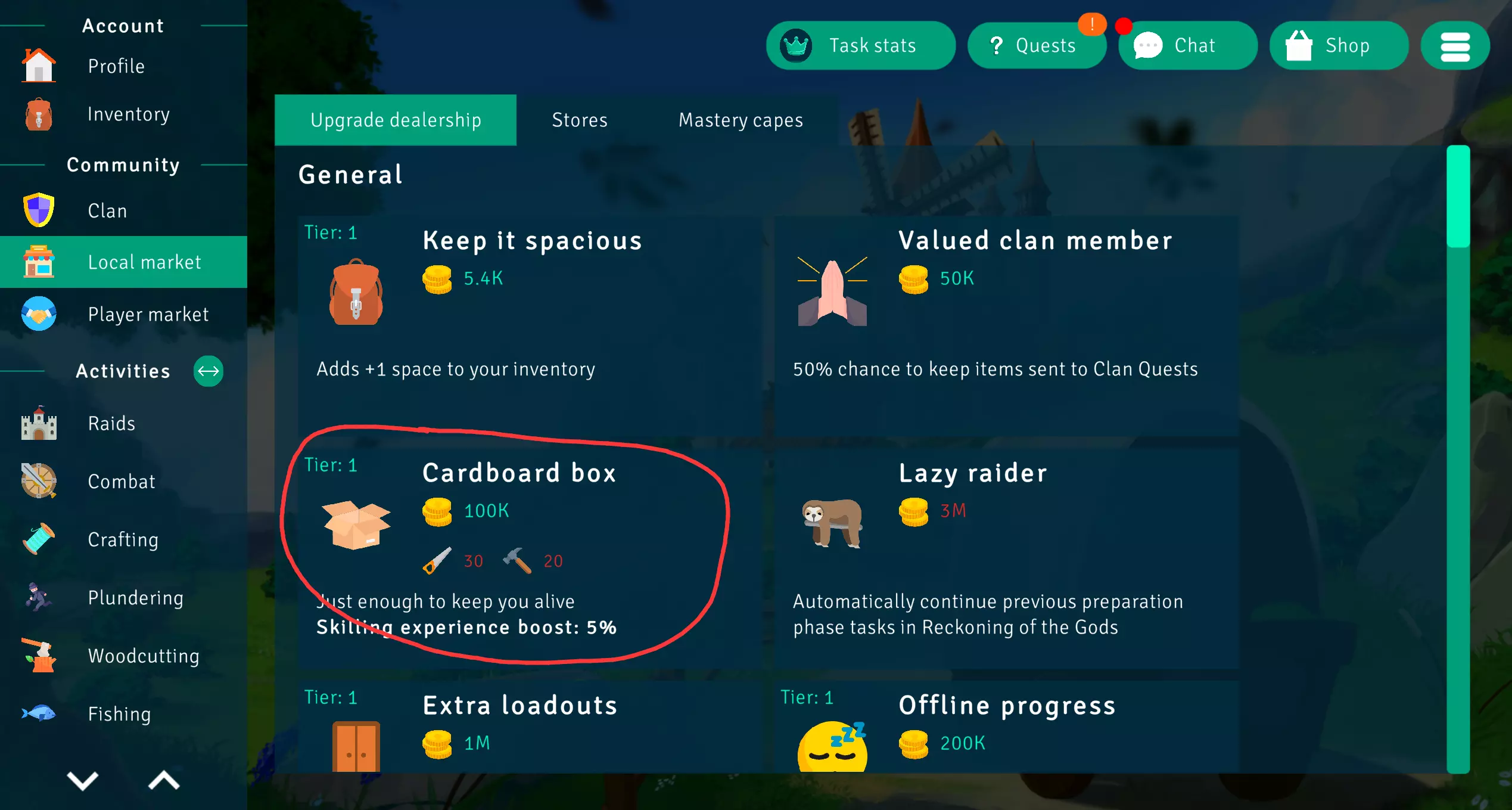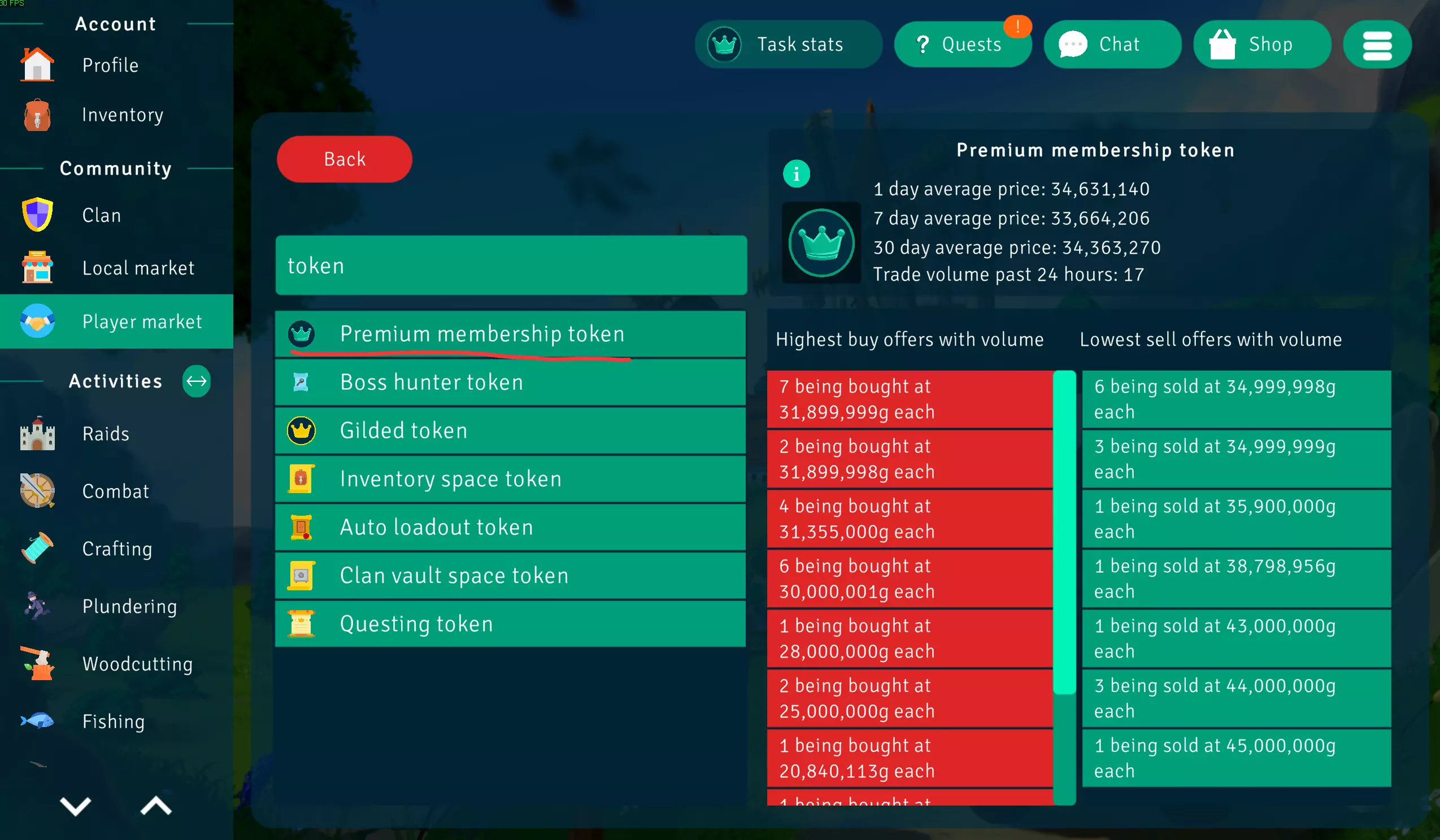 1. 觅食 2. 农业 3. 酿酒 4. 木工 5. 敏捷 基本流程 游戏内有一种高级代币,可极大改变游戏的全成就难度或游玩难度,本指南建议先尝试获得高级代币后再开始真正培养角色。 在玩家市场(player market)----搜索报价(search offers)----输入“token”即可查看代币当前价格。