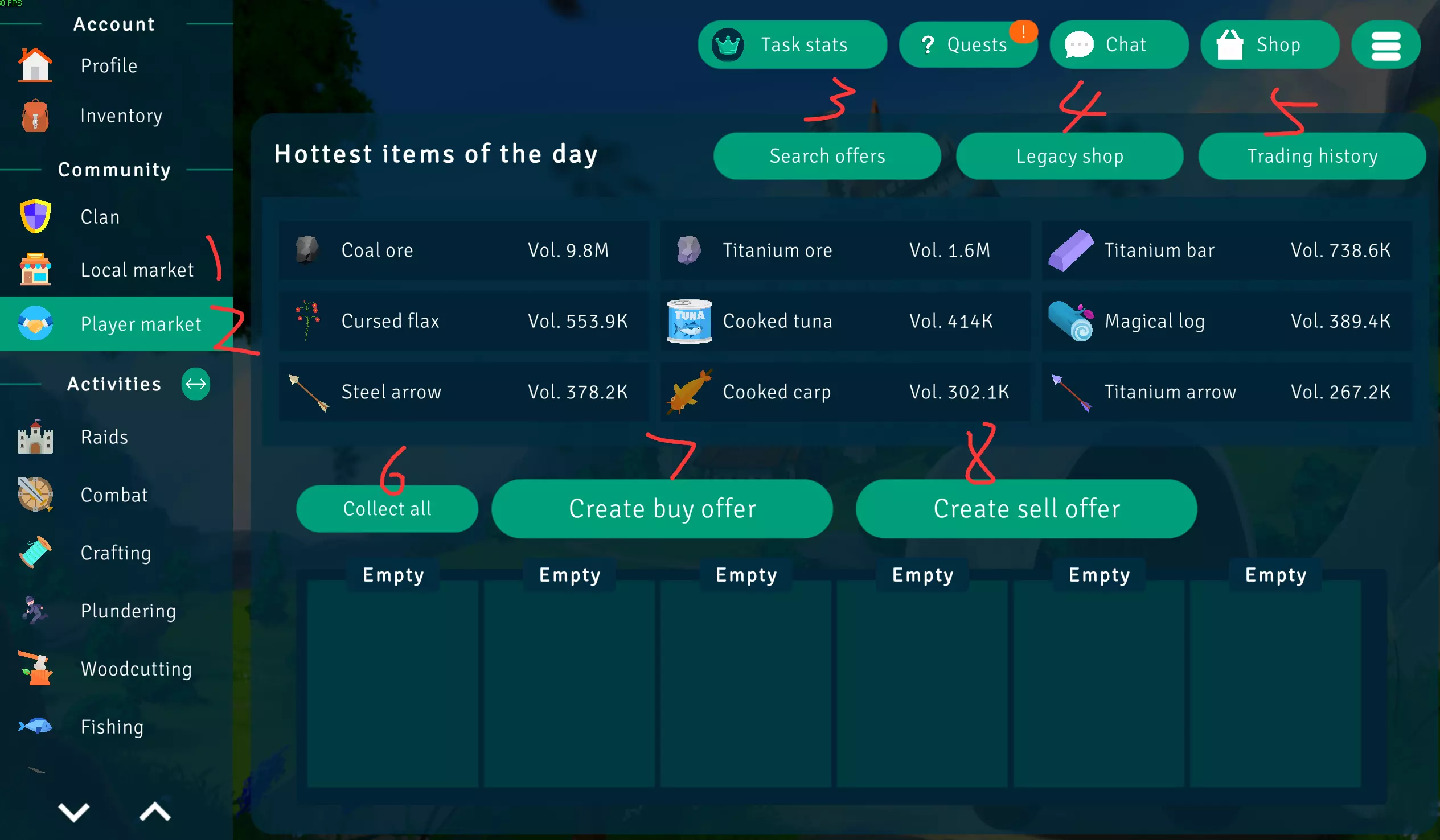1. 当地商店 2. 玩家商店 3. 寻找贩卖请求 4. 高级商店(已无法使用) 5. 交易历史 6. 收集全部(待售商品) 7. 创建购买请求 8. 创建贩卖请求 扫荡
