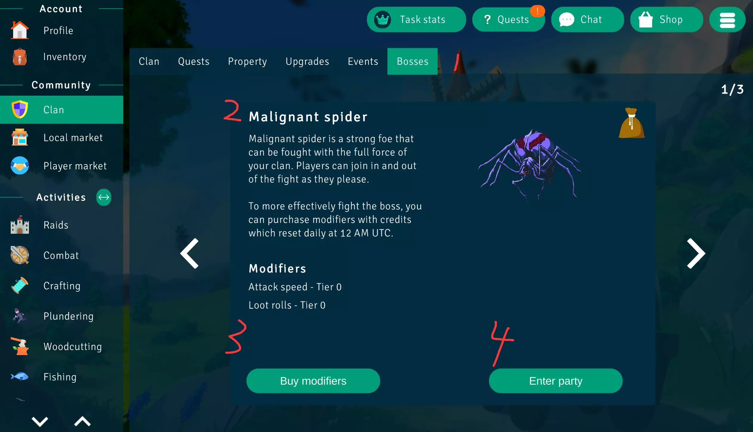 1.BOSS 2.BOSS名称 3.购买加成 4.进入队伍 商店