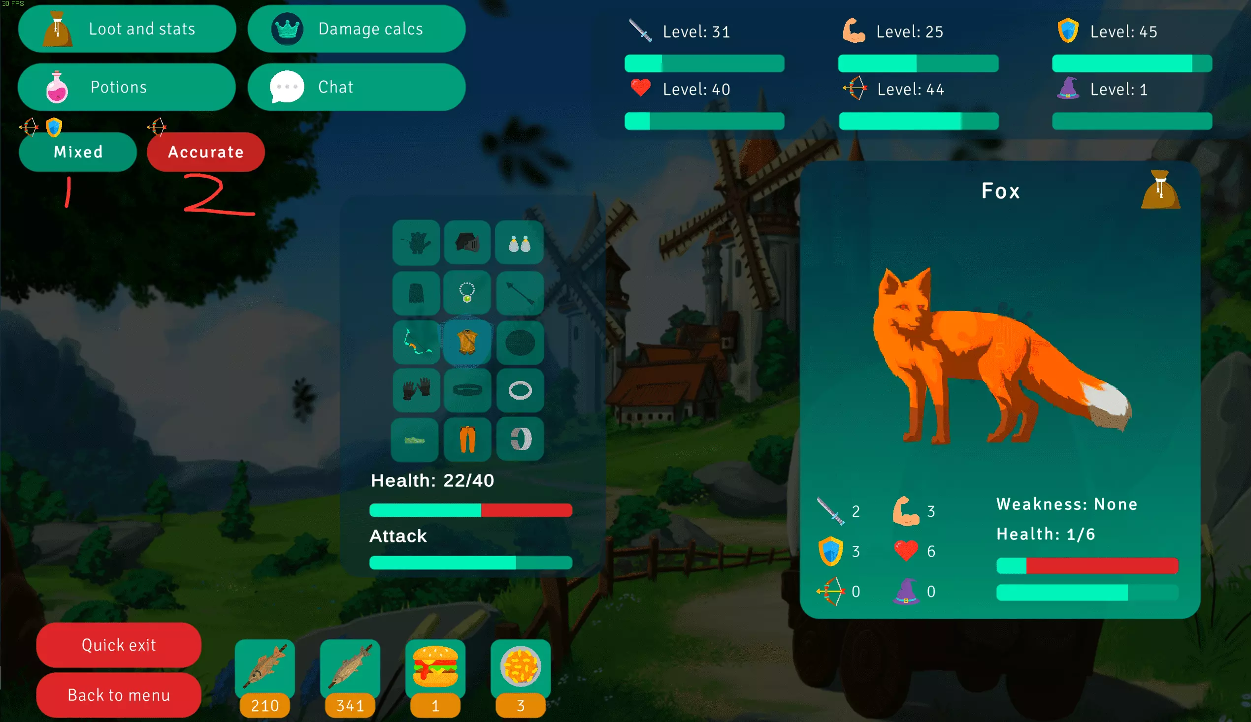 用三个账号坚持进行采矿来获取代币,只需一直开采最高等级的矿石即可。也可以花费10美元购买一个代币,但不推荐这种方式。在个人资料界面,每两小时(无需代币)点击一次小火煎可获得一次加成,代币玩家则可直接获得8小时的加成。建议将三个账号都加入一个氏族,人数越多越好。游戏的基本流程为:提升技能→获取更多更好的装备→挑战更难的BOSS,最终目标是将所有属性提升至120级并击败克洛诺斯。不过,若仅为达成全成就,过程则无需如此繁琐。技能提升没有固定顺序,但技能之间存在上下级关系,部分技能需要上级技能达到特定等级或获得特定材料后才能解锁。游戏目前有三种基本攻击方式:近战武器、弓箭和魔法。不同的攻击方式会提升对应的技能等级,且需要使用不同的武器。例如,弓箭需要制作箭矢才能发挥较高伤害。 高级BOSS存在弱点差异,可根据其弱点选择合适的攻击方式。不同装备也能对特定攻击方式提供增益效果。 战斗中可选择不同的进攻风格: - 如图1所示为混合风格,攻击主要对图示两种技能提供加成; - 图2为精准风格,攻击主要对弓箭技能提供加成。 不同风格主要影响经验值的获取方式。