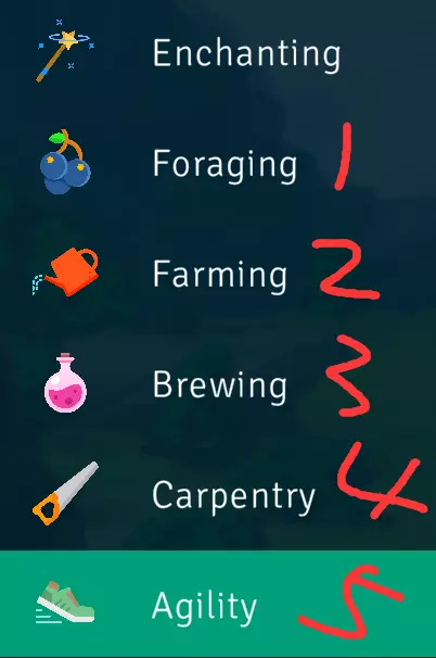 1. 掠夺 2. 林业 3. 渔业 4. 矿业 5. 熔炼 6. 青铜级 7. 铁制级 8. 银制级 9. 钢制级 10. 金制级 11. 白金级 12. 陨石级 13. 钻石级 14. 钛金级 15. 天文级 烹饪
