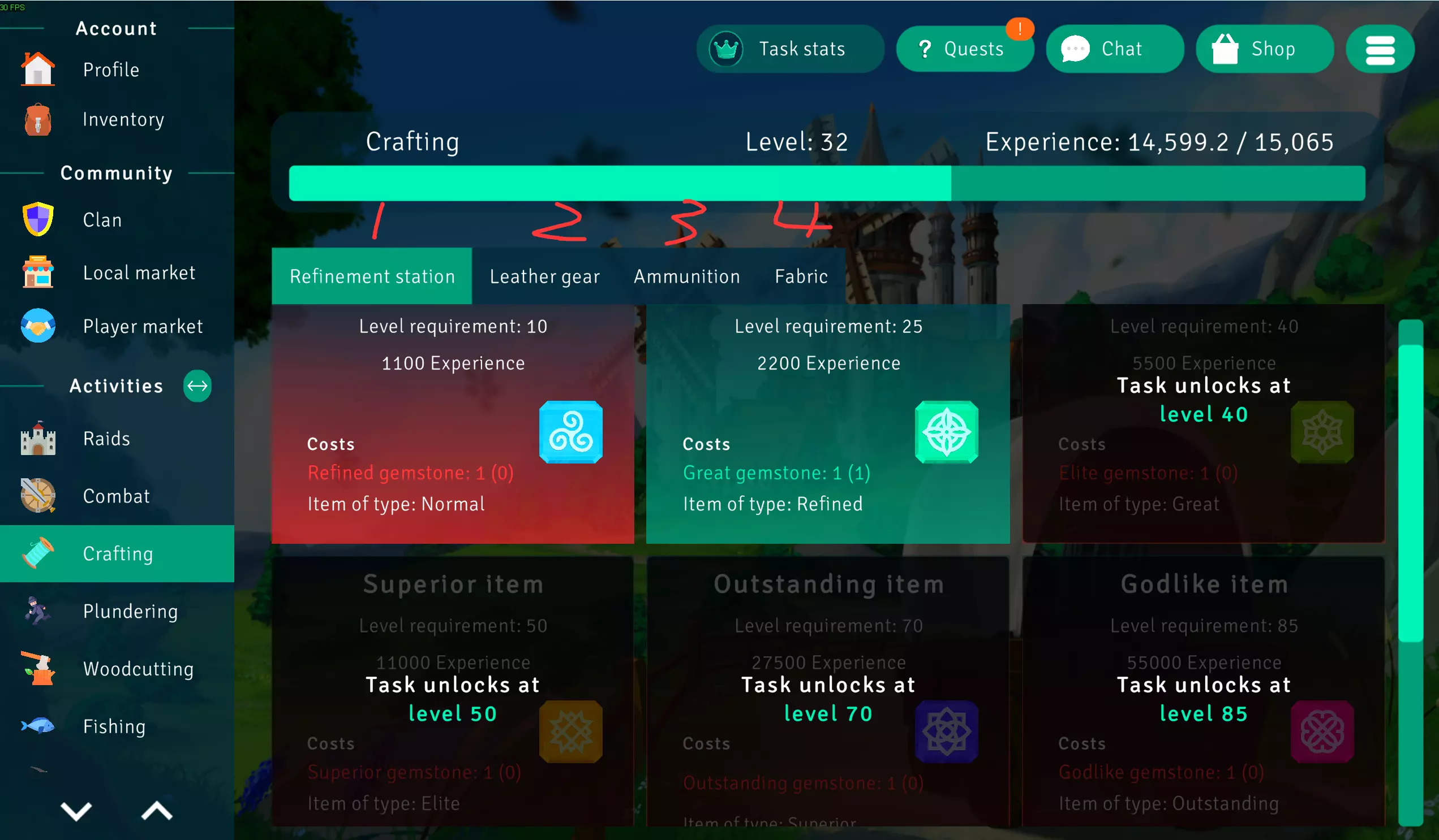 1. 精炼站 2. 皮具 3. 弹药 4. 织物 锻造