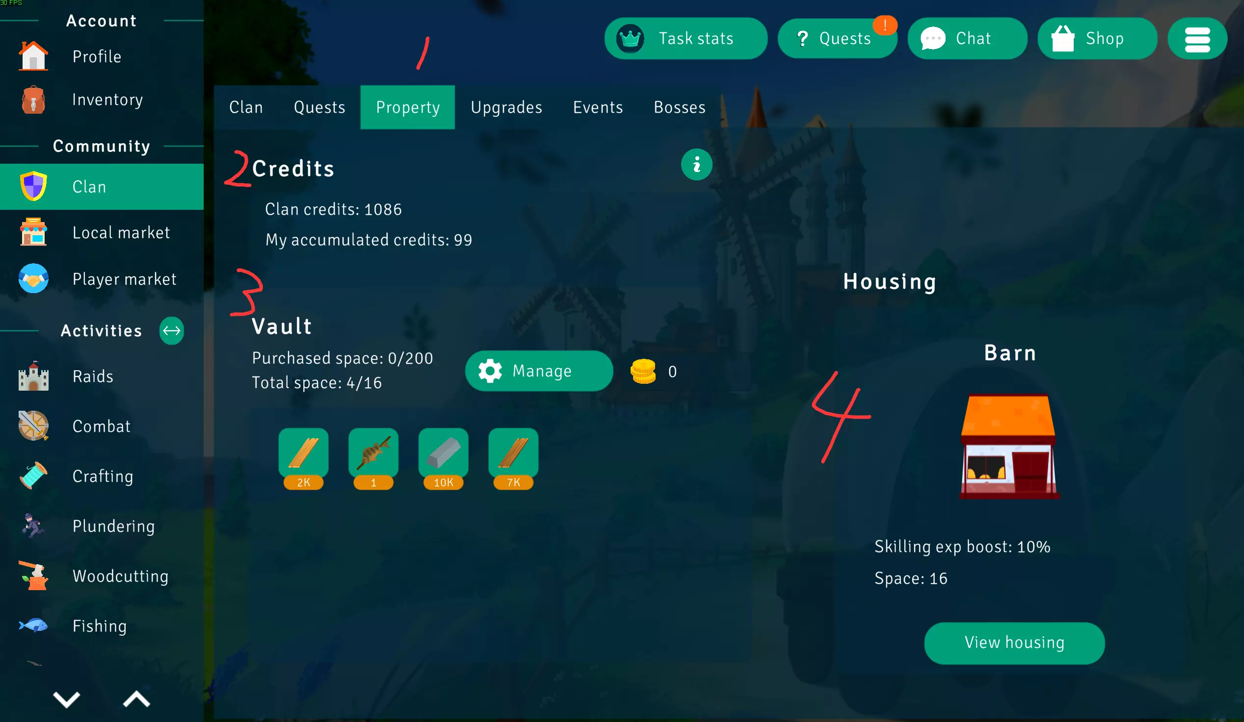 1. 财产 2. 信用点(通过各类活动获取,可用于购买氏族升级) 3. 藏宝库 4. 房产