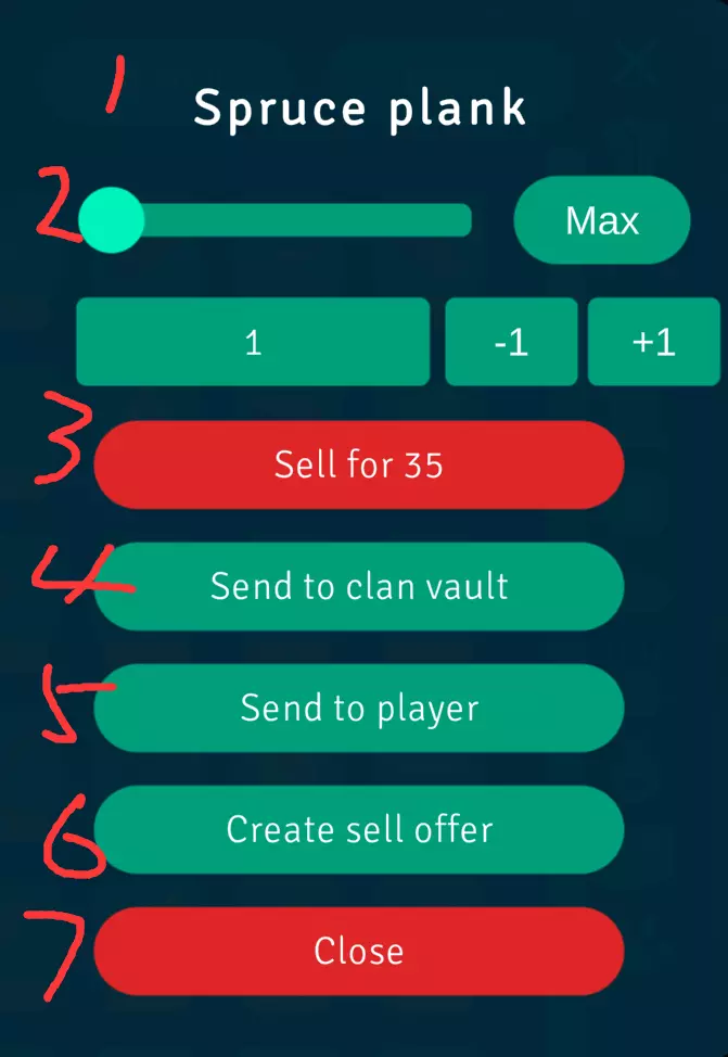 1. 物品名称 2. 操作数值 3. 以(数字)的价格出售 4. 送至氏族藏宝库 5. 发送给玩家 6. 创建出售订单 7. 关闭 注意:不同物品会有不同操作,但大体都是以上这些。
