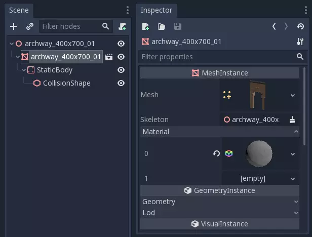 为每个部件创建新场景 如果打开一个新的.scn文件,你会发现一个带有某个 tileset 部件的网格节点。如果材质设置正确,材质会自动分配。但存在一个问题:网格不在场景中心,它与 Blender 中的偏移量相同。我们不应在 Godot 场景内重置位置,因为每次重新导出 tileset 时,所有更改都会丢失,网格会再次偏离。以下是我们为每个.scn部件要执行的操作: 1. 创建一个新的空 3D 场景,使其根节点为 Spatial 节点 2. 将.scn文件拖放为 Spatial 节点的子节点它将转换为网格。 将网格节点的平移重置为0,0,0。 将网格节点的名称复制到空间节点,使它们名称相同。 将场景保存到“零件”文件夹上一级的文件夹中(如果使用本教程中的名称,则为“图块集”文件夹)。最终场景的文件扩展名为.tscn,且名称与你的图块集零件相同。 最终,所有图块集零件将保存在“图块集”文件夹中。解压后的.scn文件位于“零件”文件夹下一级,原始的_Tileset文件也可在此处找到。下划线使其更容易查找,因为它通常是该文件夹中的最后一个文件。 当然,你也可以采用其他结构,但我发现这种设置使用起来很方便。 (重新)导入已更改的零件 现在更新零件非常简单。在 Godot 中关闭所有使用你想要更新部件的场景(Godot 目前在更新正在使用的网格时存在问题),在 Blender 中进行修改,重新导出 .escn 文件,返回 Godot 后你的更改将立即生效。即使在 Blender 中更改了轴心点,最终 .tscn 文件中的轴心点也会保持不变。 如果你在部件集中添加了新部件,它们会被添加到你的“部件”文件夹中。只需按照之前的相同步骤操作,并将它们另存为新场景即可。 ### 覆盖材质 你无法在 .scn 部件文件中覆盖材质,重新导入部件时所有更改都会丢失。但你可以在最终的 .tscn 文件中覆盖材质。在此处进行的更改在网格重新导入后仍会保留。 在 .tscn 文件中选择网格,然后打开“材质”分类。将材料拖放到空的材料槽位上,即可用其他材料替换该槽位中的材料。