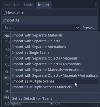 应保持“生成外部材质”功能为禁用状态,因为我们已在Godot中创建了材质。 在本教程中,将文件导出到名为“Tileset/Parts”的子文件夹,并将文件命名为“_Tileset”。稍后我会解释原因。点击“导出到Godot”以导出所有内容。确保选择Godot项目内的导出位置,否则导出将失败。 ### 重新拆分瓦片集 导出文件后切换到Godot,Godot将导入该文件。最终你会在“Tileset/Parts”文件夹中得到一个名为“_Tileset”的单个文件。选择“_Tileset”文件,切换到“导入”选项卡,点击“预设...”并选择“导入为多个场景”。预设加载后,你可以点击“重新导入”按钮重新导入文件。文件将自动拆分为原始部分。每个部分都保存为单独的.scn文件。