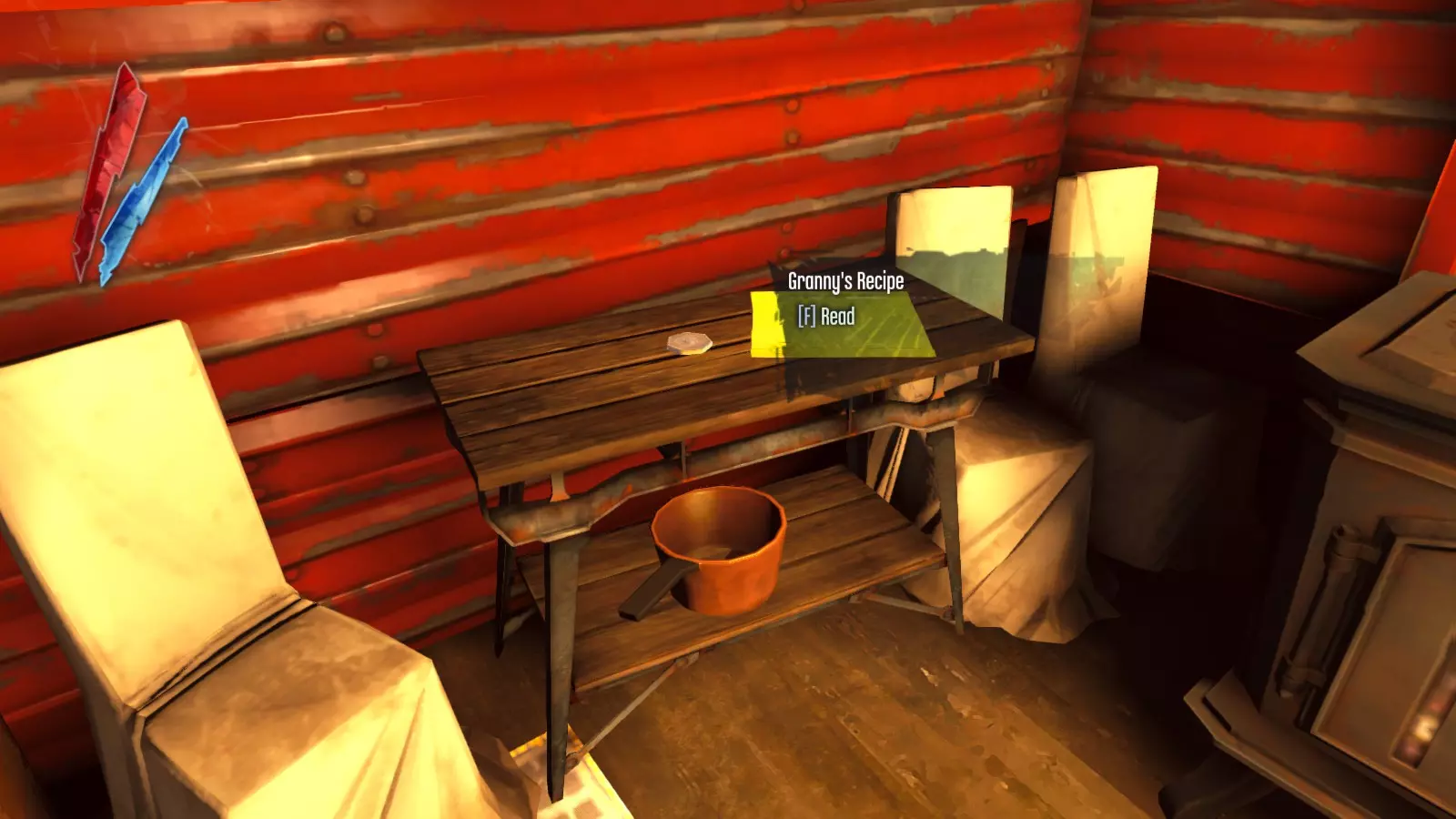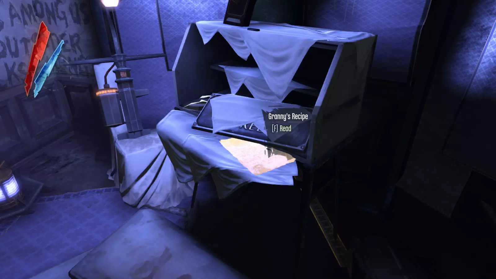 在屋内,你会在房间的角落里发现一个“异界神龛(Outsider Shrine)”。在书桌上,拿起“外婆瑞格斯的配方(Granny Rags)”。