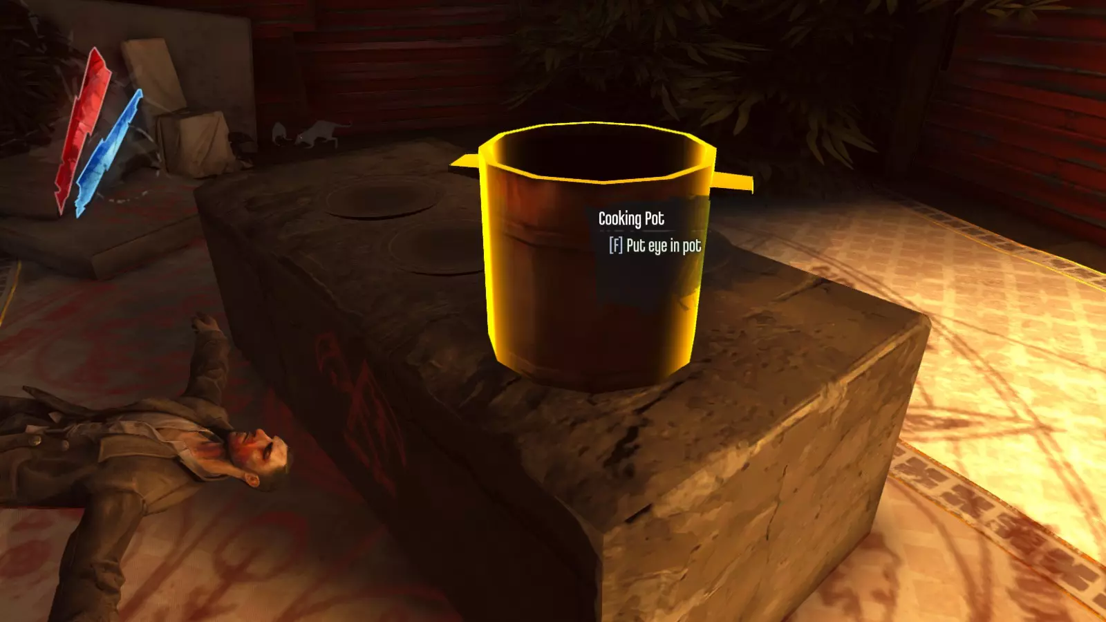 进入房间后,前往桌子处阅读奶奶拉格斯的配方。 “新死鲸鱼的左舷眼, 扑通一声入锅,血淋淋又狰狞, 哭泣者,哭泣者,不再哭泣, 让尸体安息在血刻的地板上。” 根据配方,你的目标如下: “新死鲸鱼的左舷眼。”——找到鲸鱼的眼睛。 “扑通一声入锅,血淋淋又狰狞。”——将获得的鲸鱼眼睛放入锅中。 “哭泣者,哭泣者,不再哭泣。”——指哭泣者(Weeper)的尸体。 “让尸体安息在血刻的地板上。”——将哭泣者的尸体放置在地面上的血刻标记处。