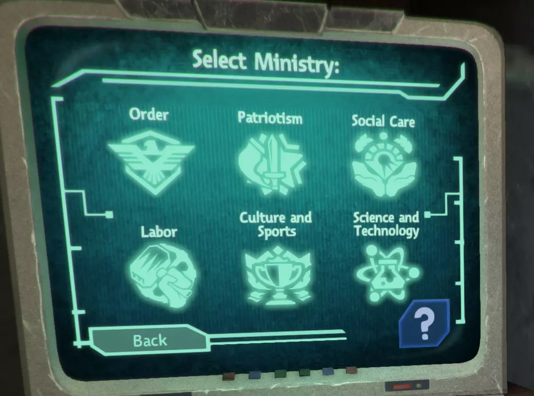 ----秩序 -秩序与一切基于法律的事务相关,例如破坏公物、盗窃、骚扰等行为。 ----爱国主义 -爱国主义与领袖或战争相关的一切事务有关。 ----社会福利 -社会福利涉及社会生活的各个方面,包括住房、医院、教育等。 ----劳工 -劳工与工作和工作场所相关,例如“恶劣的工作条件”“倾倒牛奶”等情况。 ----文化与体育 -文化与体育涉及剧院、音乐(国歌除外,其属于爱国主义范畴)或体育相关内容,例如“足球比赛”“剧院导师”。 ----科技 -科技显然与任何发明或机械升级相关,例如“邻国发明了吸入器”“传送带升级”。 部门选择 部门选择!这很简单。你需要根据右侧时钟显示的星期几来选择办公室,然后在右侧的办公室列表中滚动查找,选择当天开放的办公室。