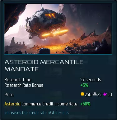 对于TEC(贸易联盟)来说,在游戏后期拥有大量 credits( credits)是一件轻松的事。但在游戏初期,情况就大不相同了。我建议优先升级商业,之后再考虑采矿升级。显示的收入已经包含了你的各种加成,包括母星收入加成。因此,仅6.2 credits/秒确实是个很低的数值,但一旦将其升到满级,就能达到17 credits/秒,这可是两倍多的提升! 小行星每秒只能提供1.2 credits,但能产出更多的金属和晶体。实际上,只需要3.5颗小行星就能产出与你满级母星相同数量的金属和晶体,因此你在游戏初期的商业投资能为你带来稳健的经济,因为在游戏的这个阶段,你主要会殖民小行星。