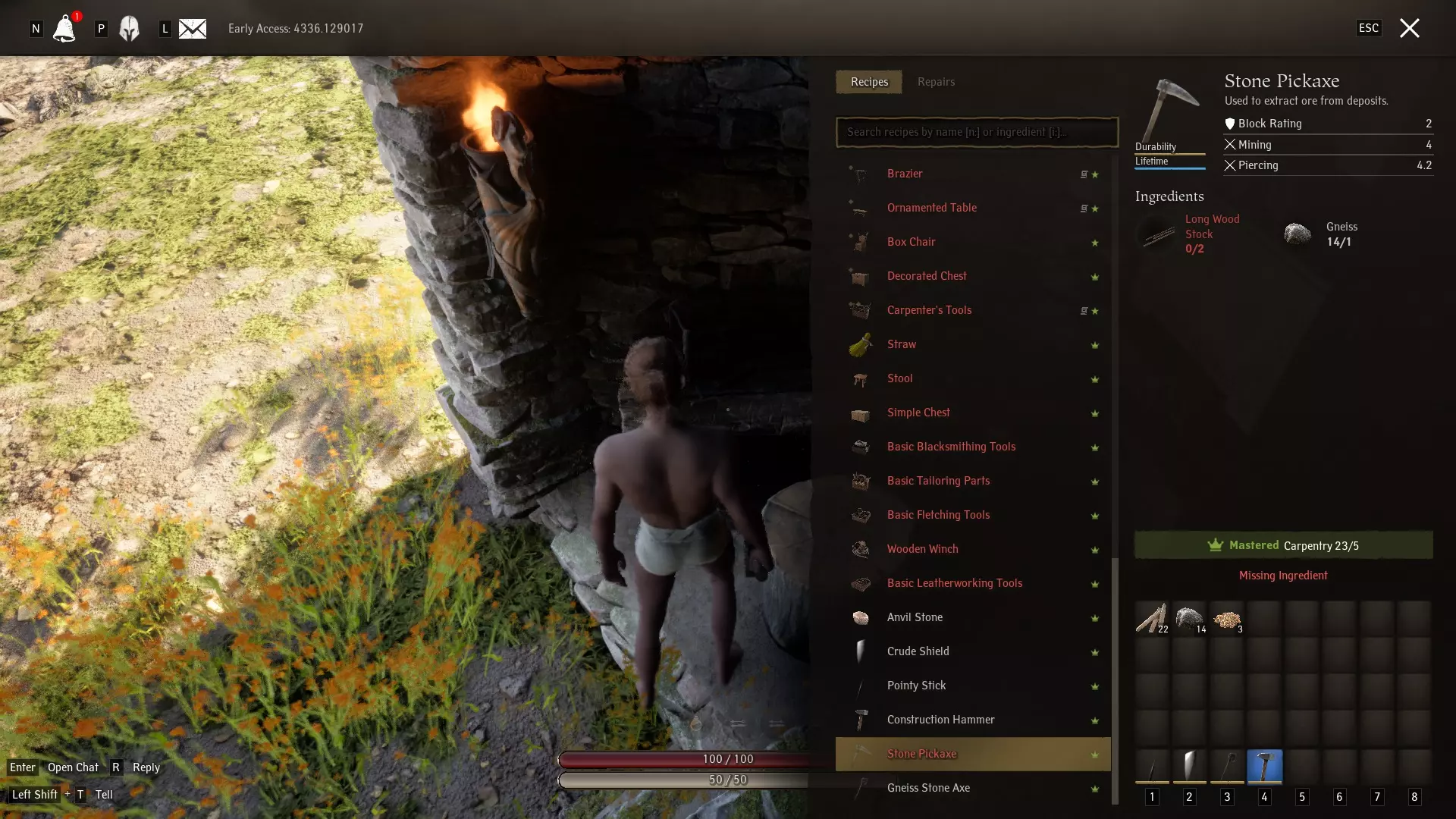如果你已经建造了木工台,那么你可以花些时间制作一把石镐,它能让你开采片麻岩、铜和锡。使用石镐采矿会获得片麻岩和沙子,这两种都是有用的材料。