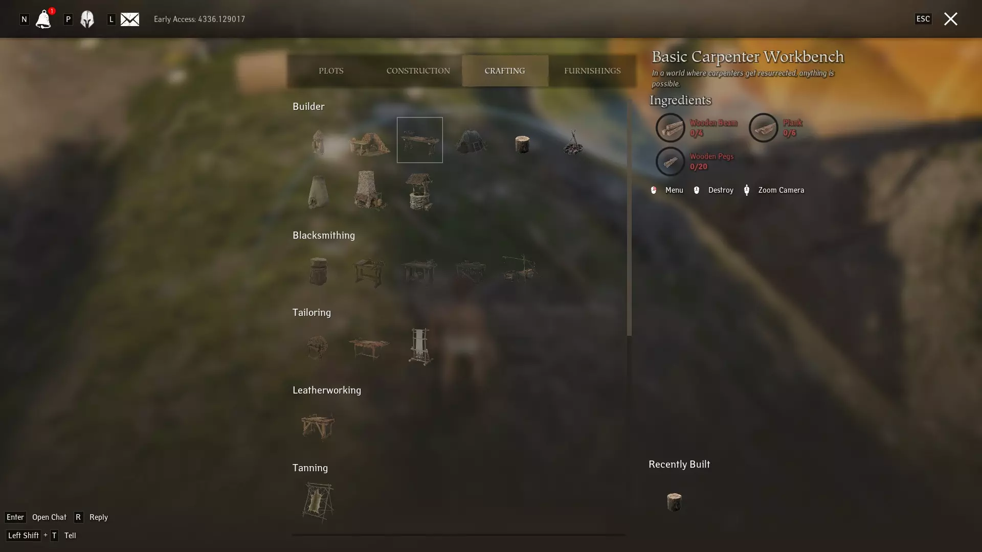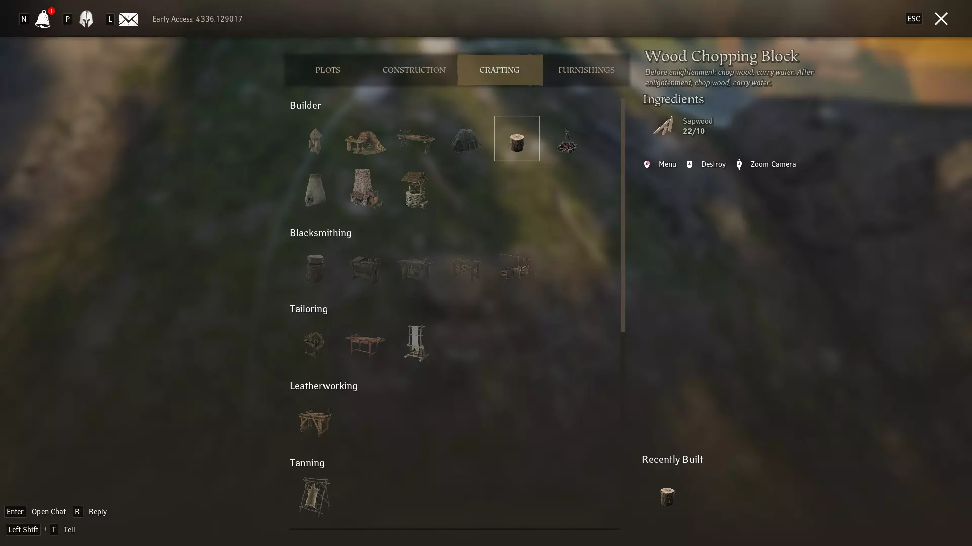 一旦你放置好自己的地块,就可以在上面建造东西了!让我们先建造基础的“木材劈柴块”,这不仅是制作重要建筑材料的必要设施,也是你日后提升木工技能的途径。