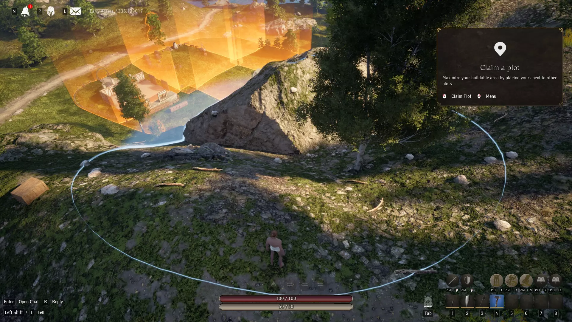 创建以下物品: 建造锤 片麻岩石斧 尖木棍 简易盾牌 新手指南第二章:寻找你的永久家园 现在你已经配备了最基础的装备。你需要找到一个可以称之为自己的区域。这在《和平之神》中非常重要——这款游戏不仅主要围绕创建自己的基地展开,而且将你的地块用作存储、制作等活动的行动基地也很关键。 那么事不宜迟。选中你的锤子。然后在锤子被选中的状态下,右键点击鼠标以打开“地块”界面。