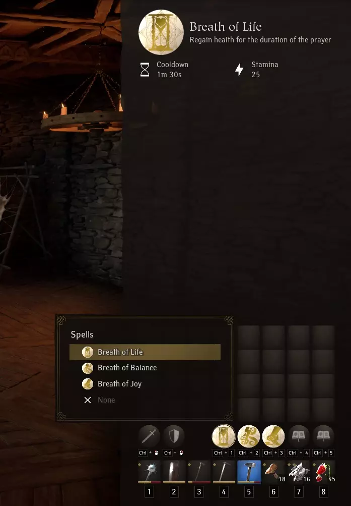 这些盔甲带有非常特殊的魔法,你可以按“I”键打开背包,然后选中屏幕右下角的5个圆圈之一,将其添加到任务栏。 生命之息:5秒内每秒恢复17点生命值。 平衡之息:施法3秒后恢复50点耐力。 喜悦之息:7秒的 sprint (疾跑)增益效果,提升移动速度,且跑步时不消耗耐力。(这是目前游戏中最棒的法术。) 选择出现的法术将其添加到任务栏后,你可以使用“Ctrl + 1至5”来施放这些法术。