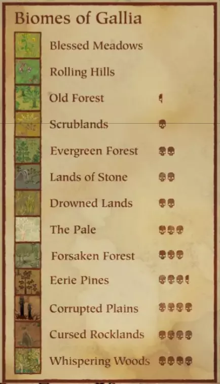 按分类学字母顺序排列(未在此列出的可能已被移除): 可采集/植物类: 苜蓿 - 苍白之地 鹅膏菌 - 常绿森林(仅限荒野) 大麦 - 石之大地、灌木丛 蝙蝠花 - 被遗弃森林(仅限荒野) 海湾牛肝菌 - 被遗弃森林 黑喇叭菌 - 被遗弃森林 黑莓 - 石之大地 膀胱麦瓶草 - 苍白之地 蓝莓 - 古老森林 蓖麻 - 淹没之地 鸡油菌 - 常绿森林 云莓 - 苍白之地 棉花 - 淹没之地 鹤望兰 - 淹没之地 冠须花 - 淹没之地 蒲公英 - 起伏丘陵 小皮伞菌 - 诡异松林 曼陀罗 - 灌木丛 致命颠茄 - 淹没之地 毒鹅膏 - 被遗弃森林 神圣蘑菇 - 古老森林 接骨木莓 - 苍白之地 金针菇 - 被遗弃森林 茴香 - 苍白之地亚麻 - 丘陵地带、灌木地 毒蝇伞 - 废弃森林、古老森林 愚人网盖菇 - 常绿森林 大蒜 - 古老森林 金罂粟 - 苍原 青苹果 - 废弃森林 锦葵 - 苍原 啤酒花 - 废弃森林 薰衣草 - 淹没之地 柠檬草 - 石之大地 洛伊奥斯之泪 - 诡异松林 绣线菊 - 淹没之地、丘陵地带 羊肚菌 - 低语森林(仅限荒野) 芥末 - 灌木地 燕麦 - 石之大地 平菇 - 常绿森林 欧芹 - 淹没之地 白头翁花 - 石之大地 牛肝菌 - 古老森林 长春花 - 丘陵地带 雨百合 - 丘陵地带 覆盆子 - 常绿森林 红苹果 - 废弃森林 红卷心菜 - 石之大地 红醋栗 - 废弃森林 红葡萄 - 诡异松林(仅限荒野) 红洋葱 - 废弃森林 红罂粟- **可采集植物/矿物** **黏土** - 所有生物群系(靠近水源的海岸线附近) **铜** - 所有生物群系(悬崖边、山脉及岩石构造附近) **燧石** - 所有生物群系(靠近水源的海岸线附近) **片麻岩矿床** - 所有生物群系(悬崖边、山脉及岩石构造附近) - **植物** **石芦苇之地** - 所有生物群系(靠近水源的海岸线附近) **玫瑰丛** - 淹没之地 **迷迭香** - 苍白之地 **黑麦** - 石之地、苍白之地 **鼠尾草** - 起伏丘陵 **黄芩** - 被遗忘森林 **肥皂草** - 灌木丛 **苦苣菜** - 石之地 **繁缕** - 被遗忘森林 **草莓** - 常绿森林 **甜李子** - 诡异松林 **艾菊** - 石之地 **百里香** - 石之地 **小麦** - 苍白之地 **白葡萄** - 诡异松林、常绿森林 **狼毒** - 常绿森林(仅限荒野) **黄洋葱** - 常绿森林、古老森林花岗岩矿床 - 遗忘森林、苍白之地、石之大地(仅荒野区域)(分布于悬崖边、山脉及岩石构造处) 不纯铁矿床 - 所有生物群系(分布于悬崖边、山脉及岩石构造处) 铁矿床 - 石之大地 石灰矿床 - 苍白之地(分布于悬崖边、山脉及岩石构造处) 纯铁矿床 - 腐化平原(仅荒野区域) 锡矿床 - 所有生物群系(分布于悬崖边、山脉及岩石构造处) 可能从游戏中移除的可采集资源: 高山桧 白芷 猫草 细香葱 氯 雏菊 醋栗 山楂 大麻 铃兰 梨 菠萝莓 车前草 浮石 甘蔗 豆瓣菜