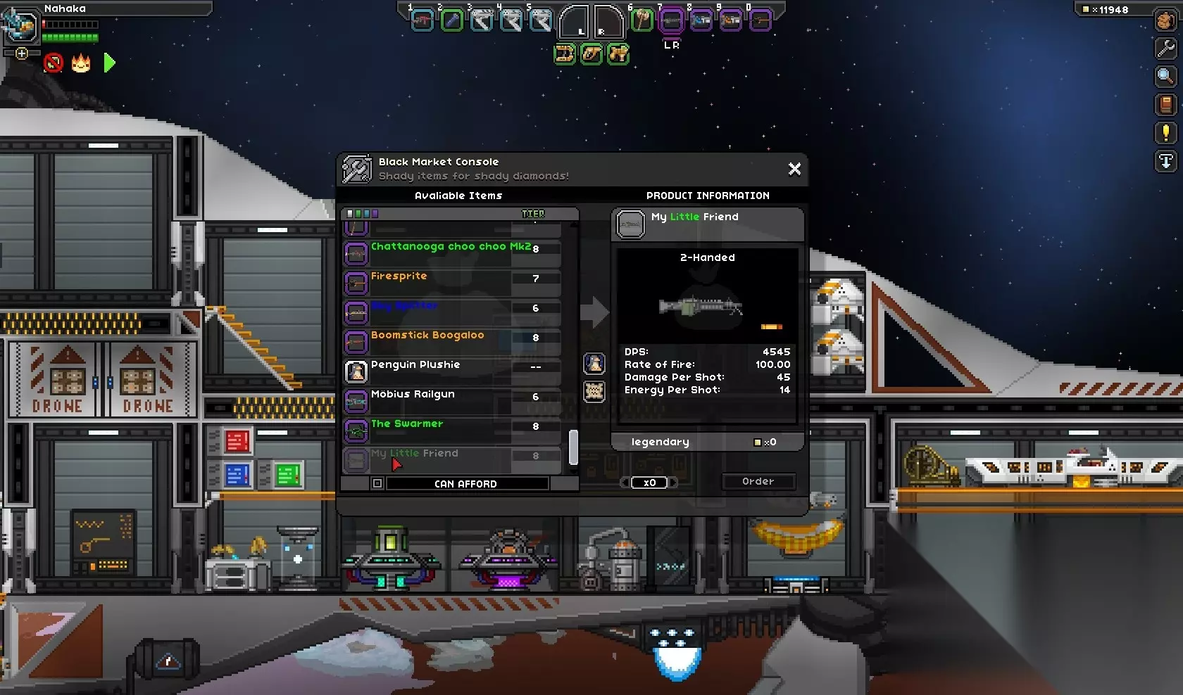 在星系半径430-380范围内(即上图中的红带区域)的空白扇区中可以找到它们,需要在空白扇区进行数次(约8次)跃迁才能发现。推荐使用早期钠晶级飞船,其尺寸应拥有约4-5个装备槽,且护盾至少达到40,000。 随着0.16版本战斗更新,斯沃克斯会伴有2-4艘鱼雷艇,它们会立即向你开火。因此建议你快速跳过他的对话,在鱼雷艇的联合火力将你摧毁前立即攻击它们。 存在一个成就,需要反复点击第三个对话选项。(听着,你这个小……)旅行装备商人(XSTN-IV) 在任意星区中,会随机间隔刷新一名某种类型的旅行商人,并广播其正在营业的消息。其中有一定几率出现装备商人。装载机、商人和其他民用船只的对话中也会不时提及该商人。 旅行装备商人将以1,500,000 credits的价格出售XSTN-IV神器。 神器交付任务(XSTN-V) 参考“The Four”,这一系列小Boss属于Xanion级别的对手,其任务通常出现在靠近银河核心屏障的公告板上。 人工智能(XSTN-VI)