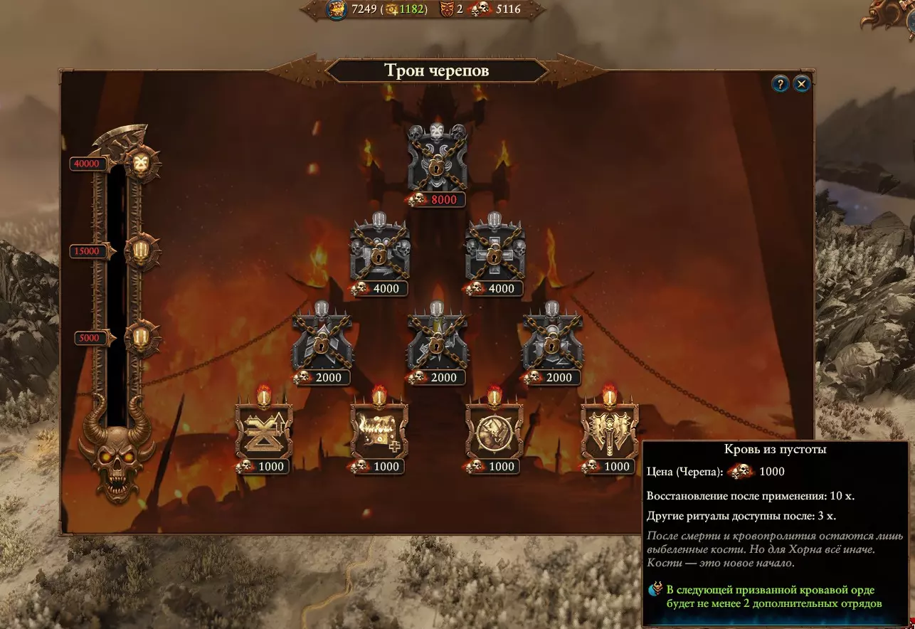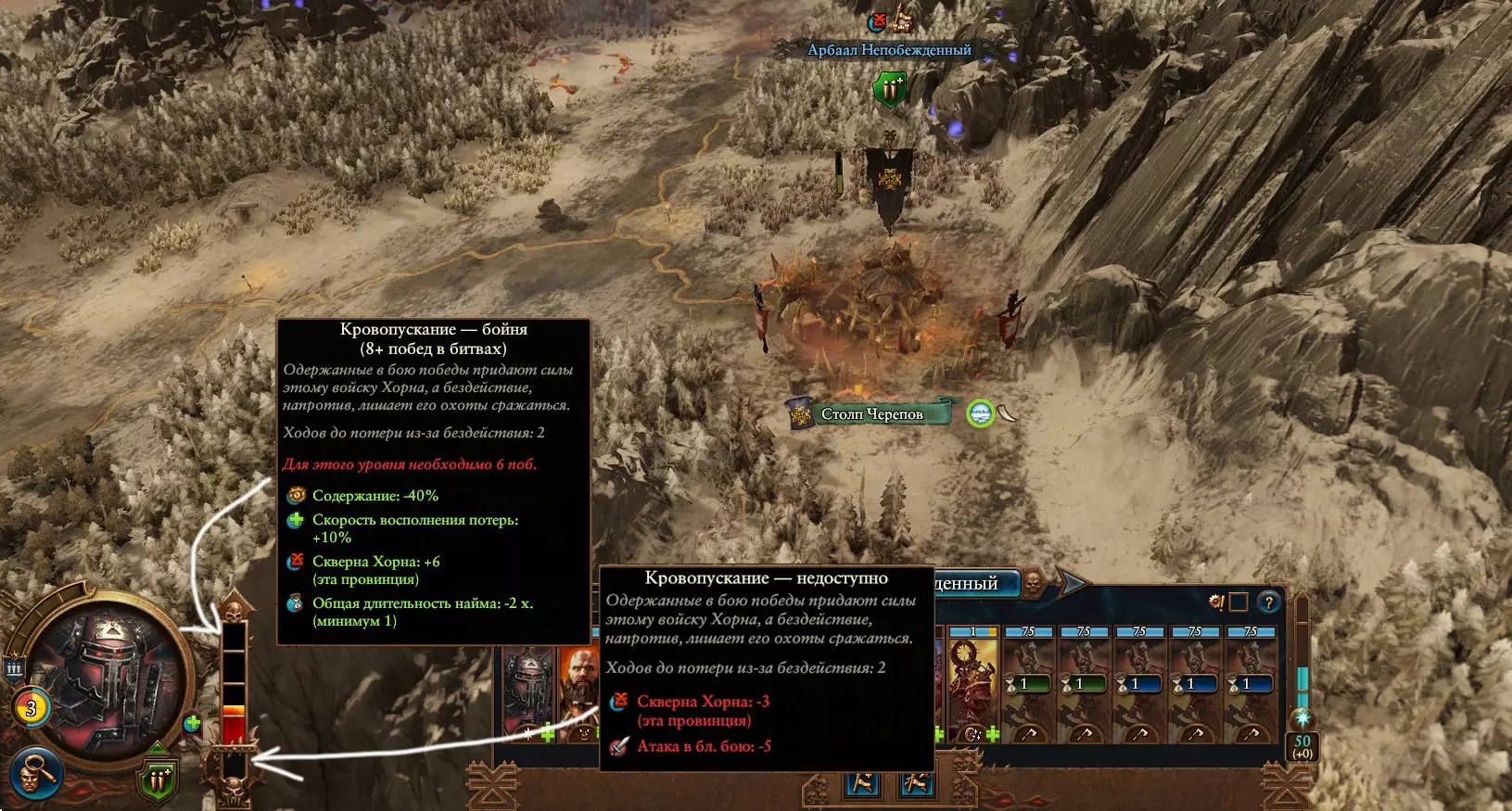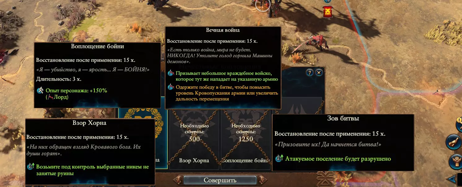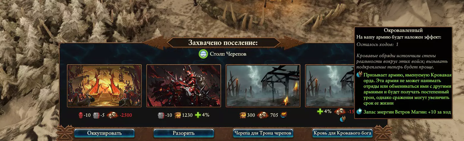 说到焚烧定居点,恶魔(Хорни-мены)可不只是能摧毁“小屁股村”,还能为了至高无上的存在(Самого)而这么做!那位最终的存在会露出满意的微笑,并赐予我们一整支免费的“血之军团”。这是一支完整的战斗部队,包含5到17支不同等级的劣质部队。没必要同情这些家伙,因为他们毫不客气地消耗着军费。所以尽管派他们去焚烧另一个定居点吧。那里还有第二部落、第十部落、第二十部落……这是游戏的主要漏洞,因为它允许刷出数百万的军队,这些军队会在50回合内覆盖整个地图……亲身测试过。