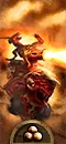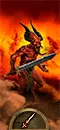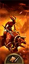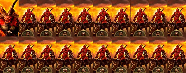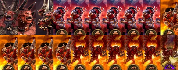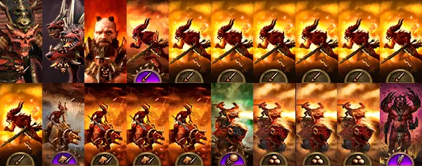 恐虐的升格放血者。这些暴躁的大头恶魔没有尾巴,但手持双手剑。红皮肤的家伙们不穿盔甲,不过这一点由其对步兵具有优势的出色伤害所弥补。而且,恶魔的攻击是魔法性质的——尽管恐虐并不喜欢魔法。与普通恶魔相比,它们的属性得到了提升,外观也相当酷炫。我觉得这些肌肉发达的家伙象征着恐虐。火焰剑能提供带有“地狱之刃”效果的火焰攻击,该效果可在击杀敌人后增加伤害。其唯一弱点是防御力较低,因此务必保护它们免受弓箭手的攻击。在战斗中,火焰剑能出色地砍杀身披铠甲的敌人,但无论如何都无法避免损失。