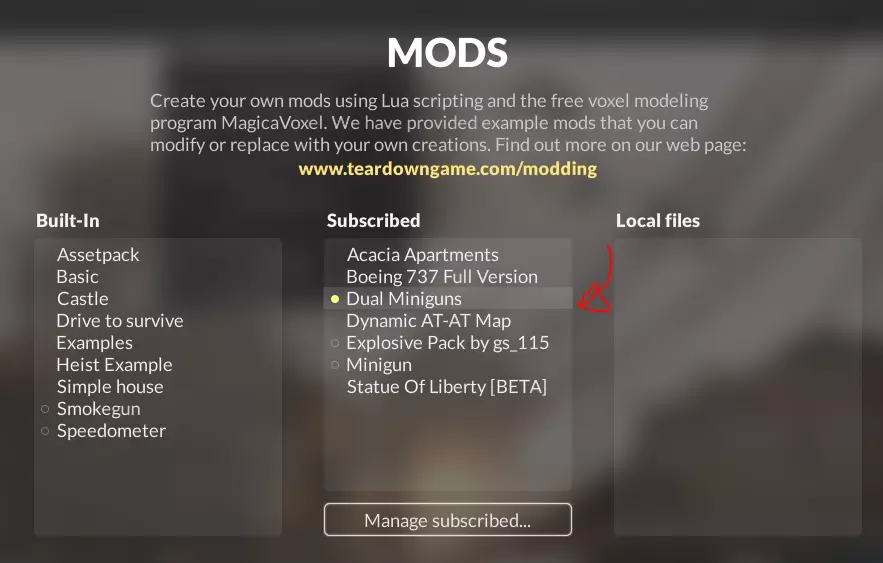 2. 双持迷你 guns 模组(Dual Miniguns Mod) My Cresta 制作的双持迷你 guns 模组(Dual Miniguns Mod)是辅助后续步骤的实用工具。 安装方法:点击下方指南中的链接。 https://steamcommunity.com/sharedfiles/filedetails/?id=2400975518&searchtext= 再次进入《拆迁》(Teardown)菜单,点击“模组”并激活该模组。