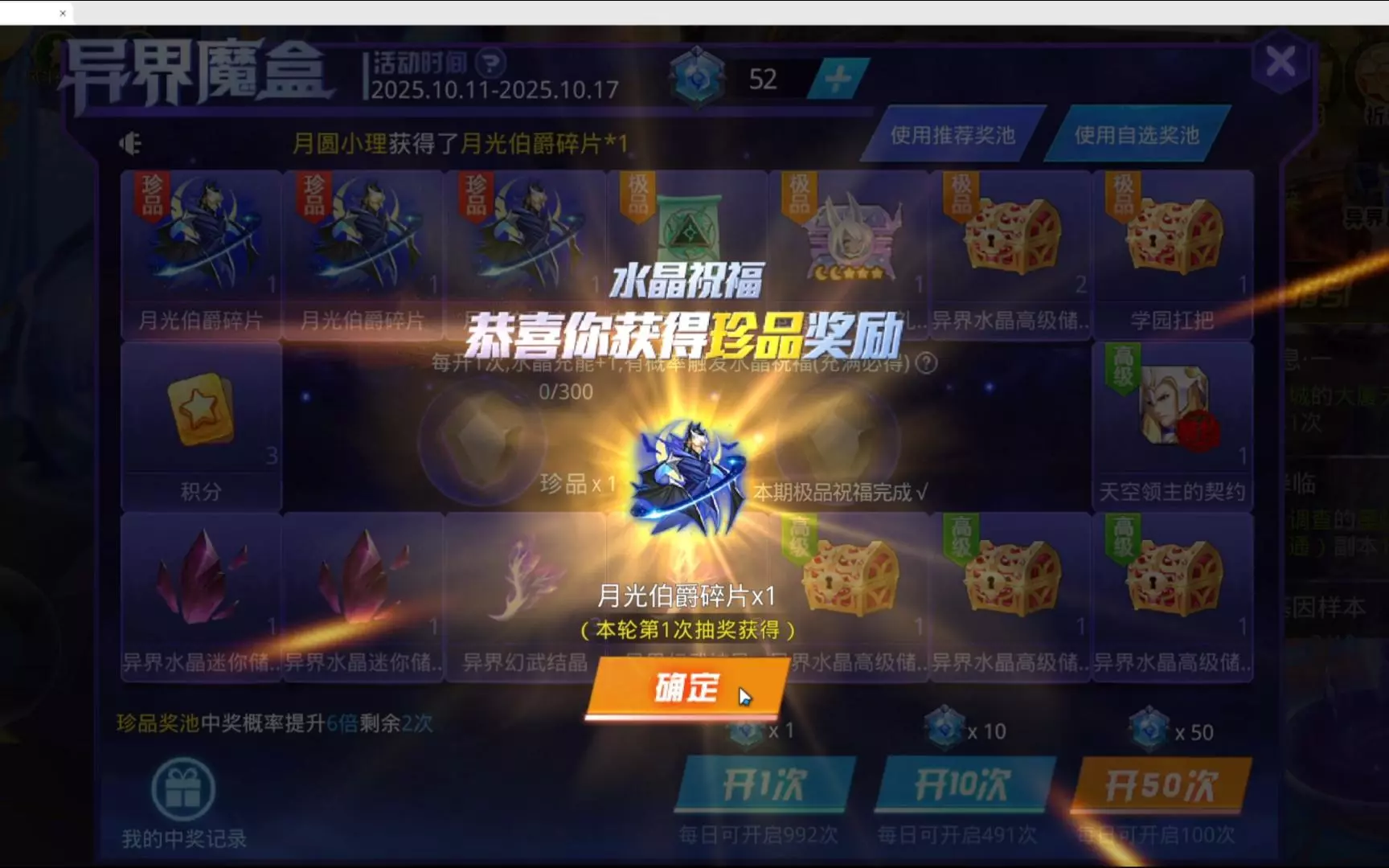 玩家刚升级到《天天炫斗》贵族11,开启异界魔盒收获颇丰,开出了异界六星圣宠礼盒I等奖励,还完成了珍品和极品祝福,运气极佳。