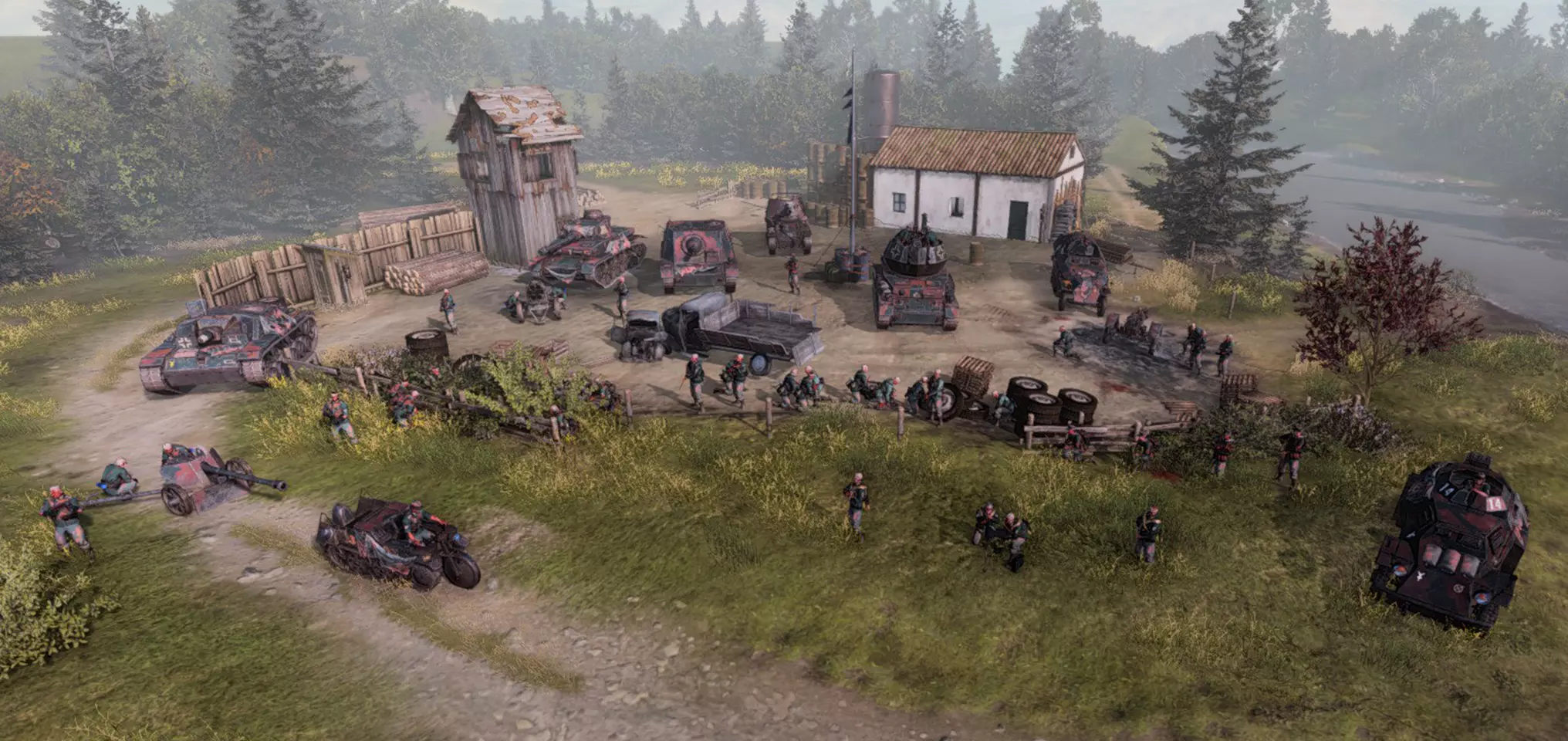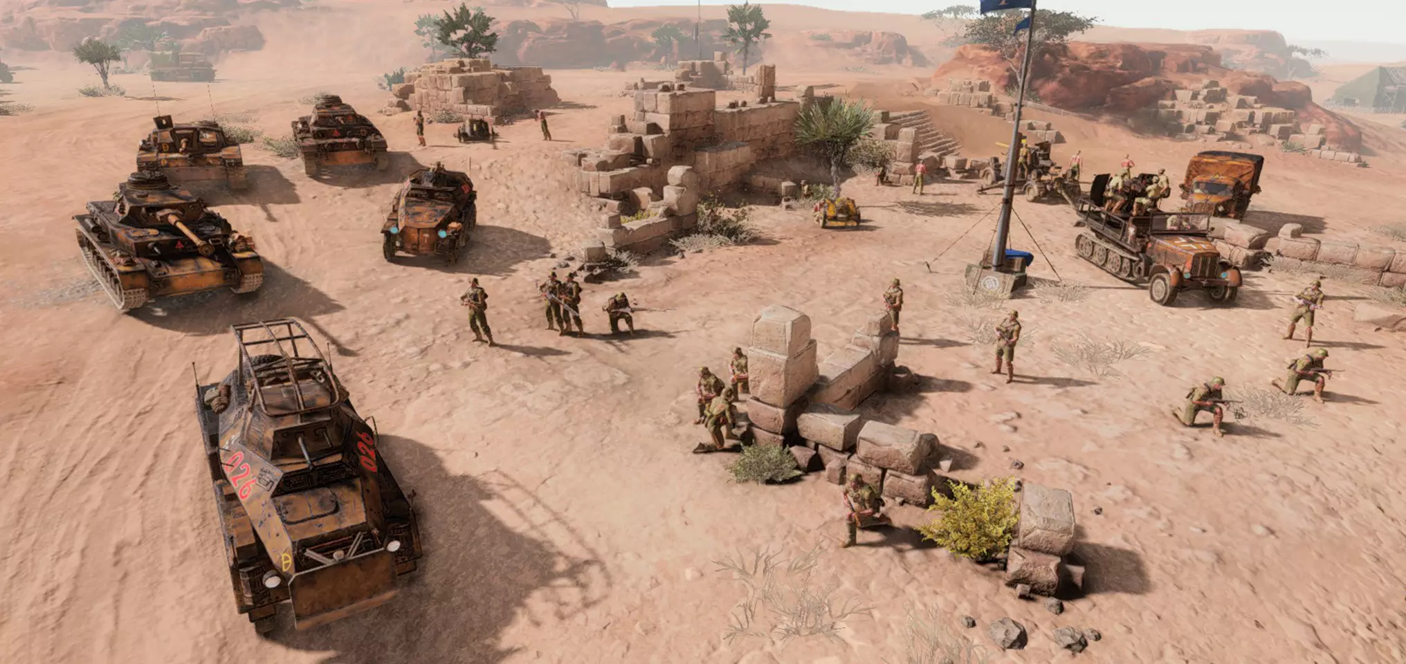 德国非洲军团 - 沙漠之猫 非洲军团在其沙漠领域中运用了卓越的伏击战术,“沙漠之猫”小队便是这一战术的化身。利用天然的土黄色伪装与人工阴影隐蔽你的部队,机动至伏击位置以突袭敌人。