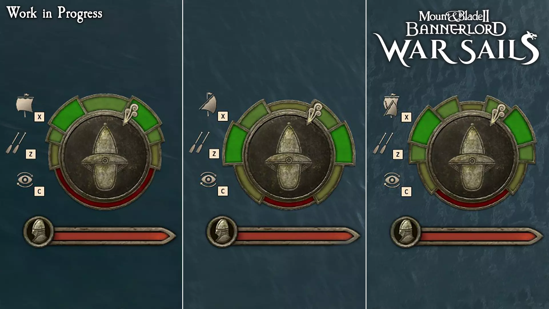 风向刻度盘,从左到右依次为:方形帆、三角帆、混合帆。 当风力减弱时,桨手便成为你的生命线。划船在海战中是次要的推进方式,能让船只在风帆静止时依然移动。玩家也可直接操控船桨,当船只靠近其他舰船时,船员会收起船桨,以避免与附近船身发生剐蹭。普通的船体接触不会损坏船桨,但直接撞击可能会——撞击点附近的船桨可能会因受力而断裂。 如果你将强大的帆具调整至有利风向并加速,在船只已高速行驶的情况下,船桨的作用就微乎其微了——了解这一点或许至关重要。毕竟,每个坐在划桨凳上的人,都意味着甲板上少了一名弓箭手。你可以下达三种级别的划船指令: - **停止划桨**——座位空出,所有船员准备战斗。 - **半功率划桨**——半数座位有船员操作,提供稳定推进力的同时保留部分人手用于战斗。 - **全功率划桨**——所有座位都有船员操作,最大化速度但减少甲板上的战斗人员。 借助船桨,你可以在无风情况下操控船只、原地转向,甚至倒划。