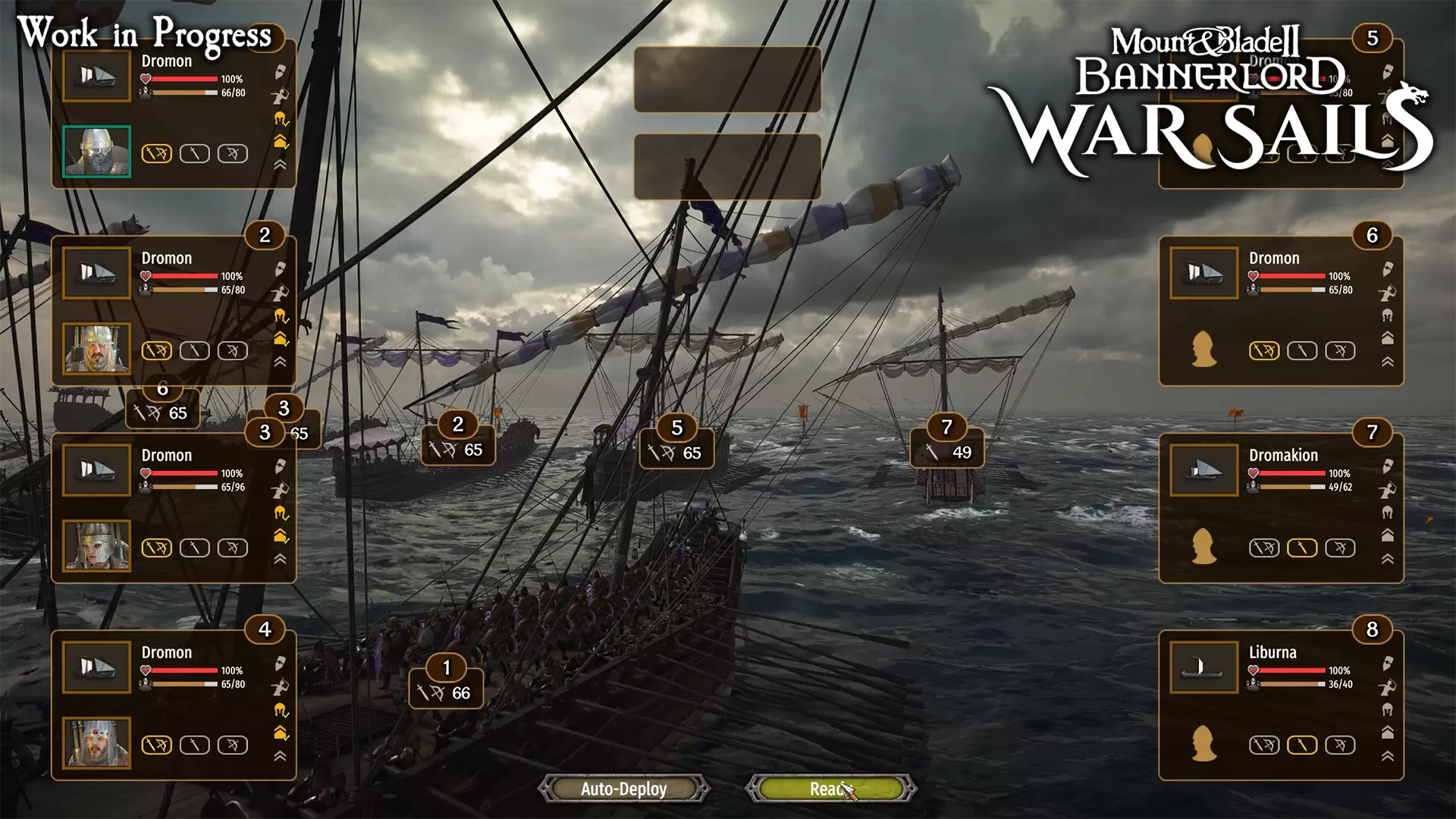 开发日志:海战 《战帆》将海洋化为战场。风力、船桨以及船员的海战准备状态至关重要,而你投入战斗的舰船只有在操控得当的情况下才会具备威胁。本篇日志将聚焦海战体验:如何掌舵、接舷战如何进行、撞击如何生效,以及一场战斗如何从初始齐射发展到绳索与甲板上的激烈交锋。 扬起风帆 战斗开始前,战斗部署阶段允许你组织部队——就像在陆地上一样。然而在海战中,每个编队代表一艘单独的舰船及其船员。在此阶段,你将选择你的旗舰(即你亲自操控的船只),同时将其余舰船分配给同伴或友方贵族。军队在一场战斗中可部署的舰船数量由其成员的特长决定,每一方最多可派出8艘舰船。如果你的舰队舰船数量超过此上限,你可以查看舰船名册并决定派遣哪些舰船参战。对于喜欢快速开始战斗的玩家,你也可以选择“自动部署”,立即起航迎击敌人。