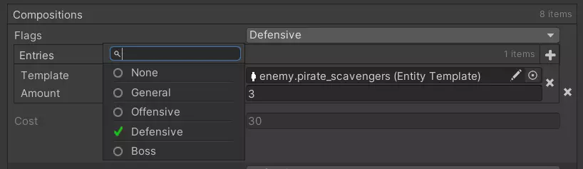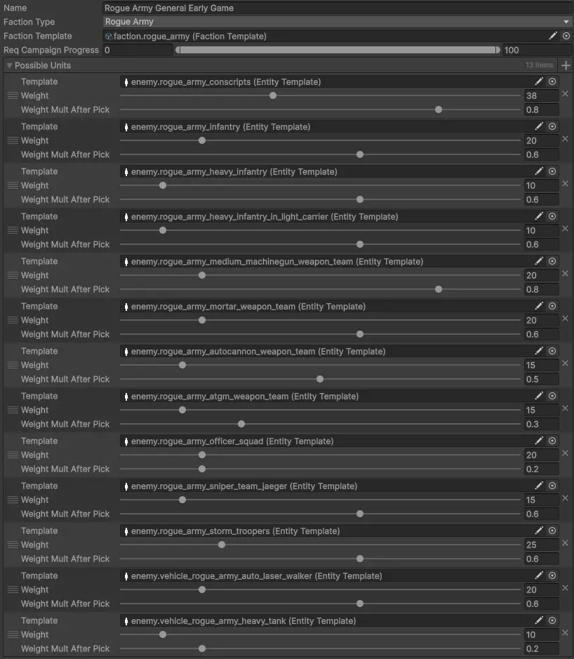 然而,问题就出在这里。 对于任务可能拥有的每个补给点数值,我们都必须手动创建多种军队列表。例如,在700补给点时,我们需要创建大约10种军队列表,每种列表都由不同的单位组合而成,且总补给点都在700左右。而我们必须为游戏中从450到2000的几乎所有补给点数值都进行这样的操作。 那么,如果游戏尝试选择890补给点的军队列表,但该数值没有对应的列表,只有830和950补给点的列表时,会发生什么呢?为了确保战斗中始终有敌人,我们不得不允许游戏选择与目标补给点数值接近的列表。因此,可能会出现玩家携带890点战力,而敌人仅携带830或950点战力的情况,这使得玩家要么过于弱小,要么过于强大。 为了确保始终有合适的部队配置列表,我们不得不创建数百种单位组合,但这样一来,我们就无法追踪哪些组合存在、哪些不存在,从而导致了大量混乱,最终违背了该系统的主要优势之一:能够控制敌人的部队组成。 而真正的麻烦是在为某个阵营添加新单位类型时才开始的——这种情况经常发生,因为该阵营的所有部队配置列表都必须进行调整以纳入新单位。这需要耗费大量的工作。 新部队配置列表系统 从上述情况来看,显然我们需要一个全新的系统。以下是该系统现在的工作方式。敌方单位 每个敌方单位现在都有相应的补给点成本以及战役进程的最低和最高限制。这能确保某些单位只有在玩家在游戏中取得一定进展后才会出现,或者反过来说,弱小的前期单位在游戏的特定阶段不再出现。