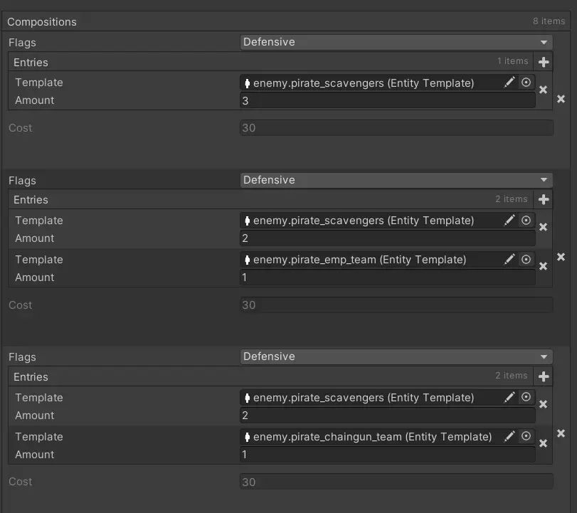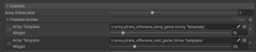 任务模板 每个独立任务现在都有一个附带选择权重的可能敌方军队列表。这确保了我们只会在海盗发起攻击的任务中遇到进攻性军队。
