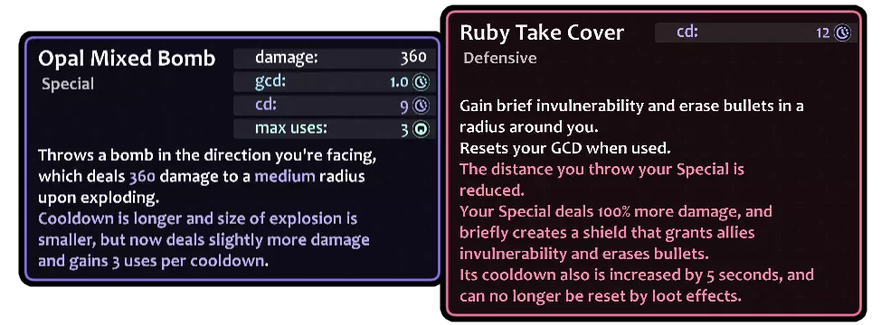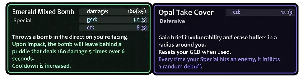 她的特殊技能是投掷“手榴弹”! 她会朝身前固定距离投掷一枚爆炸药水。 而她的防御技能就是快速蹲下躲避。 虽然没什么特别的……不过,该技能有重置公共冷却时间(GCD)的额外效果;因此,如果你想以牺牲无敌时间为代价来稍微提升一点DPS,就可以用它来更快地重新输出。 看起来是个相当简单的职业,对吧……? 并非如此!真正让榴弹兵兔子(Grenadier Rabbit)变得有趣的是她的技能升级。