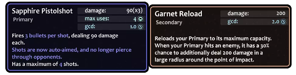 她的主要升级会将她的枪械完全转变为不同的“武器”。 例如,她的蓝宝石主要武器有点像半自动枪械。 她的石榴石主要武器是一把电击枪。 她的翡翠主要武器则是火箭发射器! 至于次要升级……实际上完全不会改变她的次要武器! 相反,这些升级会进一步强化她的主要武器。 你可以混合搭配各种效果,从而获得一些惊人的结果!