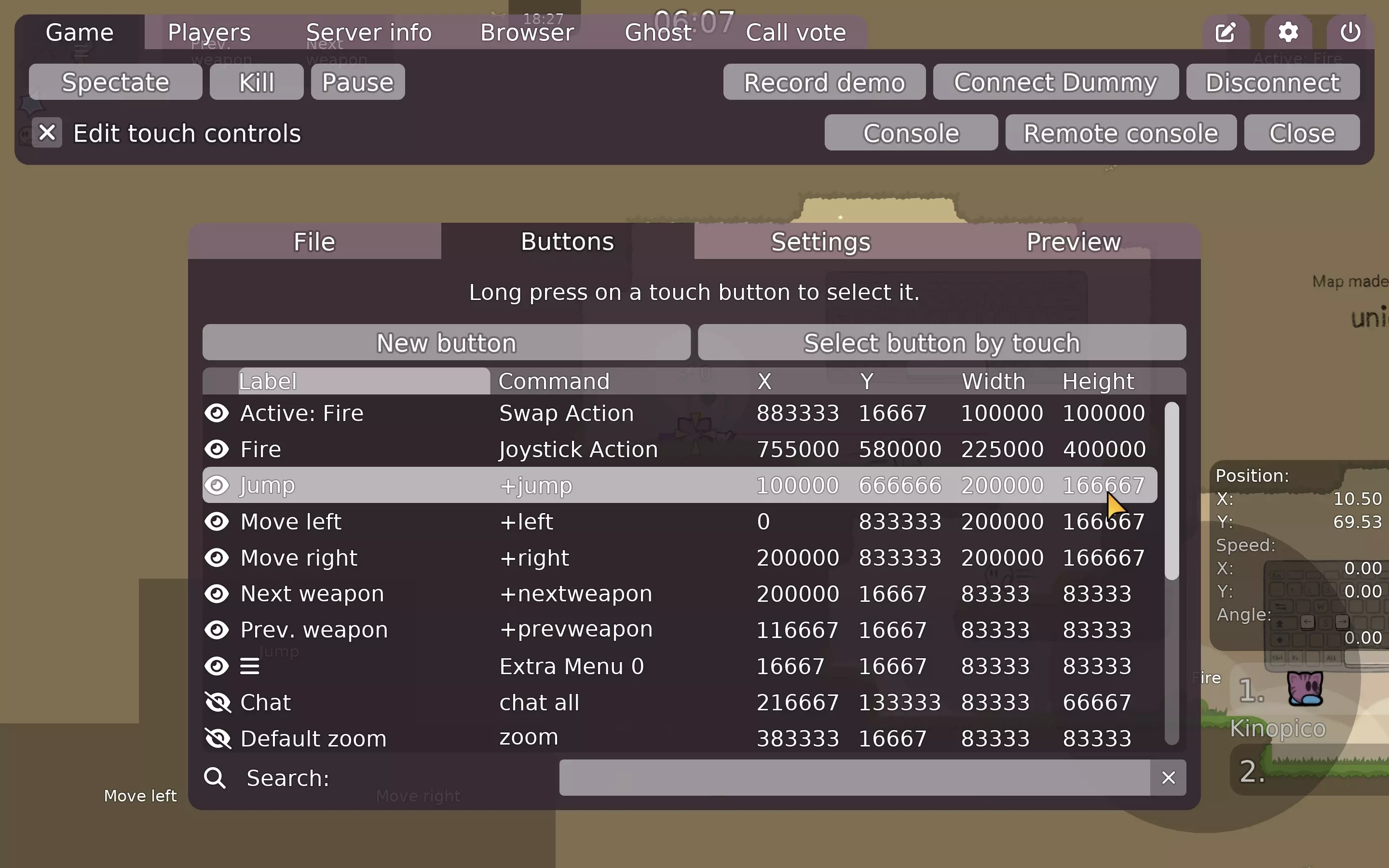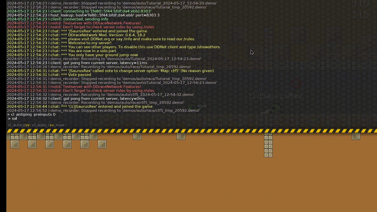 [Client] Touch controls editor [K1nop1c0] [Client] Support live playback of demos while they are being recorded [Robyt3] [Client] Add preinputs - improve antiping player prediction [KebsCS] [Editor] Keyboard support for fonts [ChillerDragon] [Client] Automatic quad clipping [AssassinTee] [Client] Add tex coords lookup table in order to improve map loading times [AssassinTee] [Client] Render 0.7 skins in server browser [dobrykafe] [Client] Add debug render option [AssassinTee] [Client] Optimize quad rendering by grouping quads [AssassinTee] [Client] Improve skin handling performance [Robyt3] [Client] Improve debug graphs [Robyt3] [Client] Make binds prints the original bind command [Pioooooo] [Client] Fix initial server browser refresh being delayed [Robyt3] [Client] Add cl_chat_background_color [SollyBunny] [Client] Fix and improve demo tuning handling [KebsCS] [Client] Enable FrozenLastTick only if prediction supported [0xfaulty] [Client] Add message to explain how to disable debug graphs [Robyt3] [Client] Fix StrongWeak indicator for spec char [KebsCS] [Client] Refactor swapchain sync object handling [Jupeyy] [Client] Show error message in server browser when no master server found [Robyt3] [Client] Predict freeze skin only for local player [KebsCS] [Client] Fix hook collision line when a player is next to a tele [KebsCS] [Client] Fix community icon pixel border rendering [Robyt3] [Client] Fix invalid stopper prediction [KebsCS] [Client] Fix overlays using wrong visual on borders [AssassinTee] [Client] Make demo recorder always record local camera setting [TsFreddie] [Client] Delay g_Config.m_UiMousesens update until scrollbar release [dobrykafe] [Client] Fix rescue resets switches [Pioooooo] [Client] Fallback to 127.0.0.1 or [::1] when resolving localhost [heinrich5991] [Client] Show more details in popup when graphics failed to be initialized [Robyt3] [Client] Prevent loading server maps and recording demos with invalid names [Robyt3] [Client] Fix laser bounce delay affecting other laser types beside rifle [AssassinTee] [Client&Server] Add support for Websockets with IPv6, network cleanup [Robyt3] [Client&Server] Add support for MSVC Edit & Continue (Hot Reload) [KebsCS] [Client&Server] Fix handling of empty commands separated by semicolons [pilonpl] [Editor] Add button to lock mouse to a single axis in editor [KebsCS] [Editor] Add preview of selected game tile in editor tile popup [KebsCS] [Editor] Fix incomplete editor grid [Robyt3] [Editor] Fix non-destructive brush with unused tiles [Robyt3] [Editor] Improve envelope editor color bar [Robyt3] [Editor] Fix color being transparent when editing multiple layers [dobrykafe] [Editor] Only allow editor undo/redo when there is no active item [dobrykafe] [Editor&Client] Implement more precise group clipping [AssassinTee] [Editor] Record brush draw action when releasing mouse outside of editor [dobrykafe] [Server] Allow switching teams after finish [Scrumplex] [Server] Use words instead of numbers for access level commands [ChillerDragon] [Server] Add ability to disable sv_practice_by_default without server restart [KebsCS] [Server] Adjust high bandwidth mode for individual clients [TsFreddie] [Server] Fix connection-oriented 0.7 packets being unpacked twice [Robyt3] [Server] Add broadcast_pl rcon command [pilonpl] [Server] Fix afk state being reset on death [KebsCS] [Server] Fix r/w sql server parameters [Spiritedswordsman] [Server] Make killer of protected kill get strong hook on respawn [Pioooooo] [Server] Add practice command 'back' [Pioooooo]