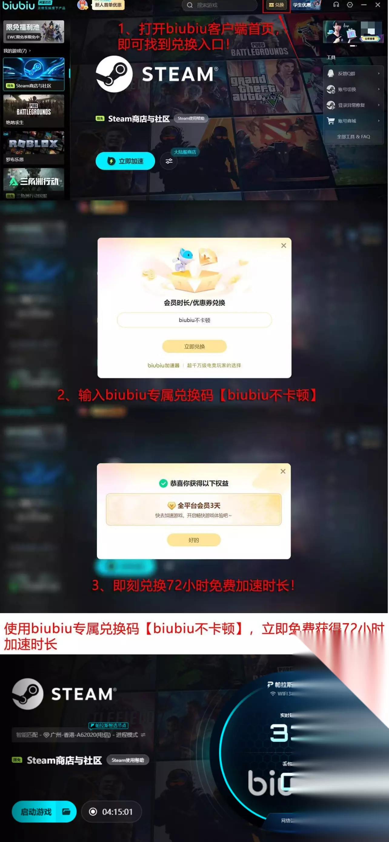 若是大家感兴趣,现在体验可以得到不少好处,比如新用户有24h体验时长,无需大家领取,初次登录时平台自动发放。平台还给所有人带来三天体验时间,该福利需要小伙伴们自己领取,每人领取一次,在指定的区域内通过【biubiu不卡顿】就可以顺利拿到手了。