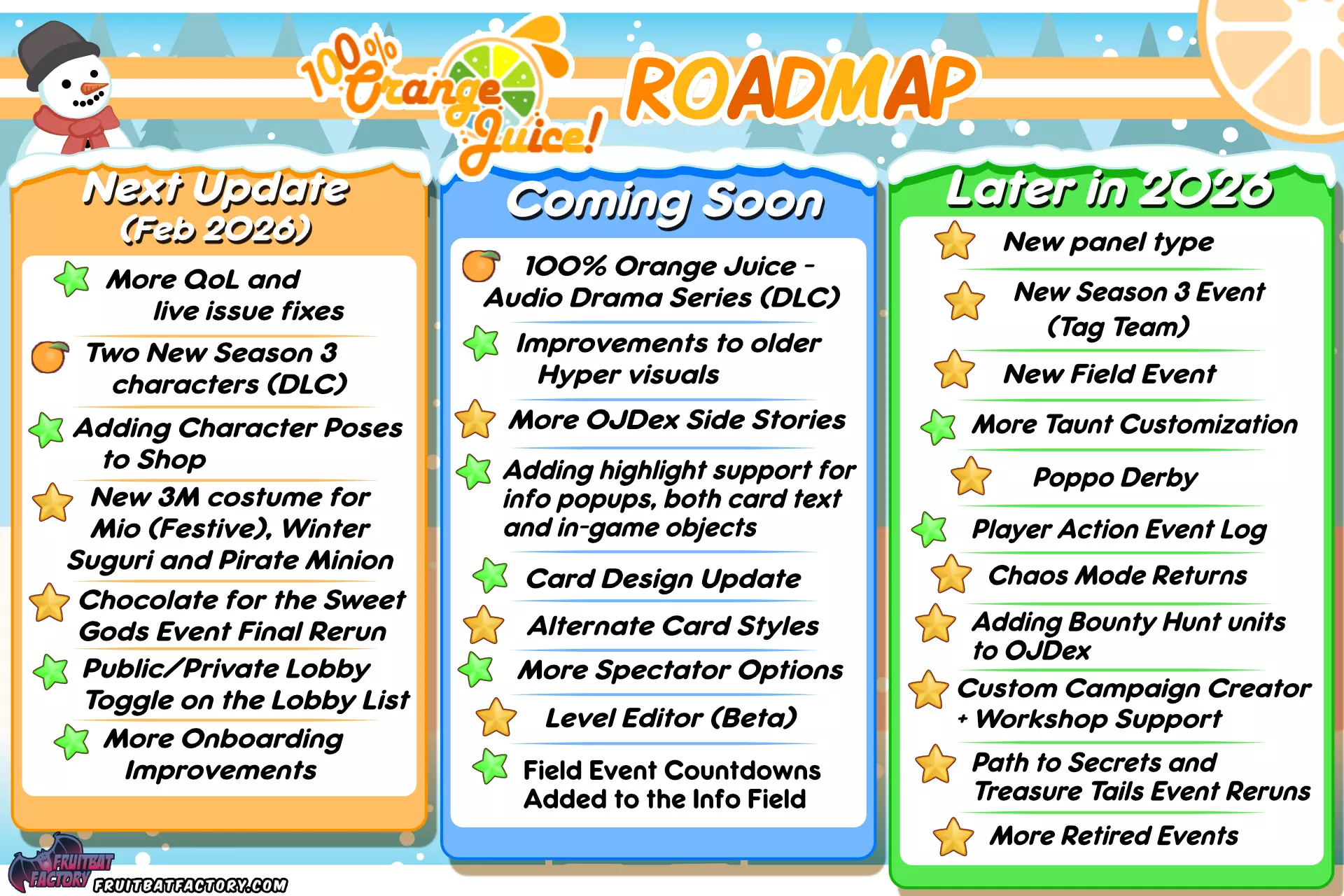 我们为大家带来了新的路线图,其中重点介绍了《100%鲜橙汁》接下来几次更新的计划内容!下一次内容更新计划于2月推出。 大家最期待的是什么呢?