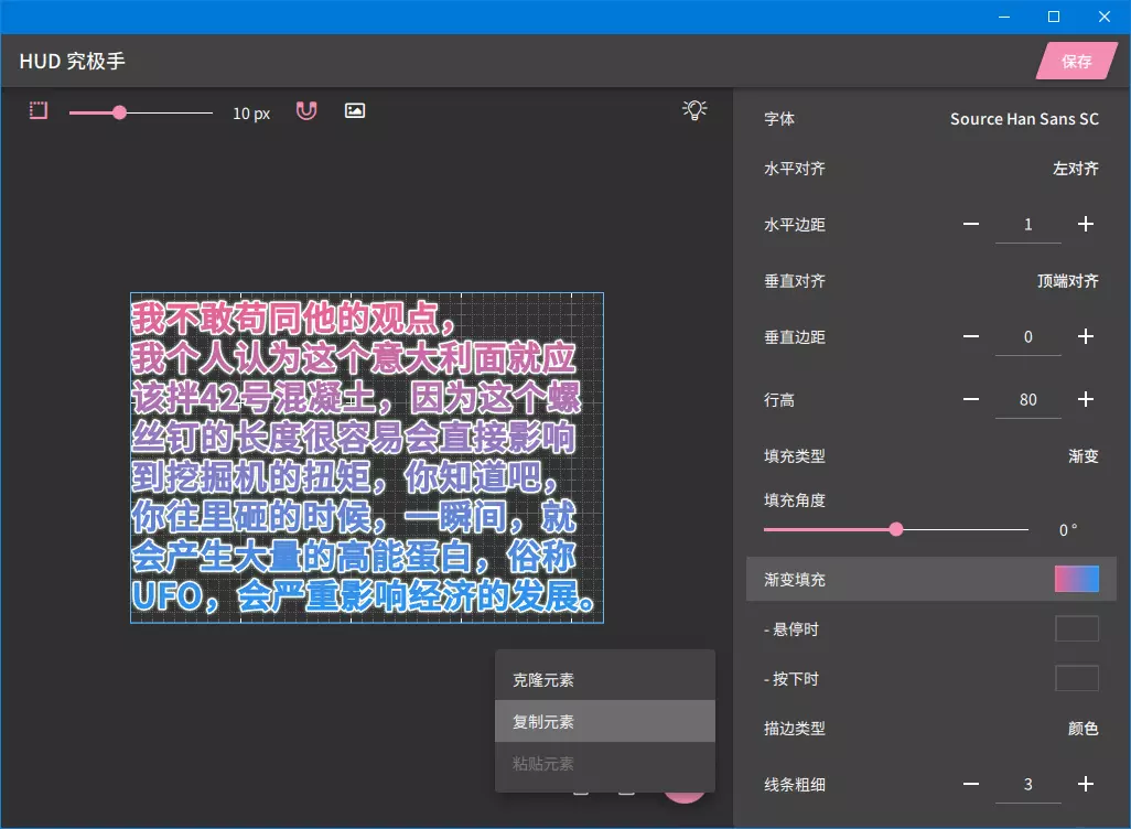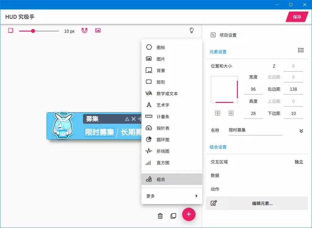 HUD Widget Extension / 1.7.0 更新内容 1. **新增组合元素“熔合(Fuse)”** 2. **新增图层效果“遮罩(Mask)”** 3. **新增图层效果“马赛克(Mosaic)”** 4. **新增项目与元素交互效果“鼠标跟踪(平移)(Mouse Track (Translate))”** 5. **新增元素选项“可见性(Visibility)”** 6. **新增项目/元素复制粘贴支持** 7. **新增第三方图层效果支持** 8. **新增选项“音效反馈(SFX Feedback)”** 9. **图像元素:新增“动画图像(Animated Image)”选项** 10. **调整部分组件选项** 11. **艺术字元素** - **新增“渐变填充/描边(Gradient Fill/Stroke)”选项** - **新增边距选项** - **新增“行高(Line Height)”选项** - **新增多行文本支持** 12. **通过熔合元素实现元素嵌套**