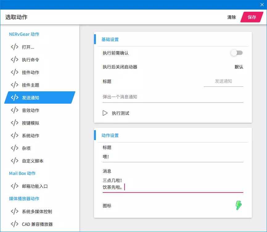 NERvGear 核心系统 / 1.7.添加操作“通知” 小部件菜单:添加“可见性”和“限制最大尺寸”开关 操作/数据:添加“标题”选项 脚本值:添加“异步数据”示例 修复在Windows 11 24H2系统中使用“显示桌面”时小部件被隐藏的问题 修复在勿扰模式下热键会阻止部分游戏输入的问题 修复部分小部件重启后缩放异常的问题 优化内存占用 启动器 添加自定义壁纸支持 修复在超宽屏显示器上无法操作启动器菜单的问题 偏好设置 添加自定义“任务”支持 启动时执行操作 执行周期性操作 执行延迟操作 常规设置 添加“最大帧率”选项 添加“使用兼容模式打开文件”选项 输入设置:为每个单独的快捷浏览器引擎 - 添加对鼠标和键盘导航的支持 - 修复自动播放视频被静音的问题 - 自定义启动器壁纸