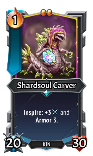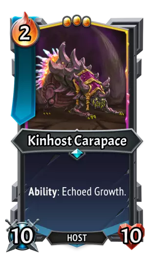 |《怪物火车》| |《怪物火车2》| | |----|----|----|----| |类型:|单位|类型:|单位| |特性:|激励:为友方单位施加+1攻击力和+1生命值。|特性:|激励:为友方单位施加+2攻击力和+1生命值。| |攻击力:|5|攻击力:|5| |生命值:|20|生命值:|20| Kinhost Carapace