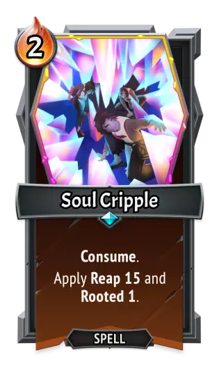 | | 《怪物火车》 | | 《怪物火车2》 | | ---- | ---- | ---- | ---- | | 类型: | 法术 | 类型: | 法术 | | 效果: | 消耗。<br>施加收割(Reap)13。 | 效果: | 消耗。<br>施加收割(Reap)15和定身(Rooted)1。 | 灵魂致残
