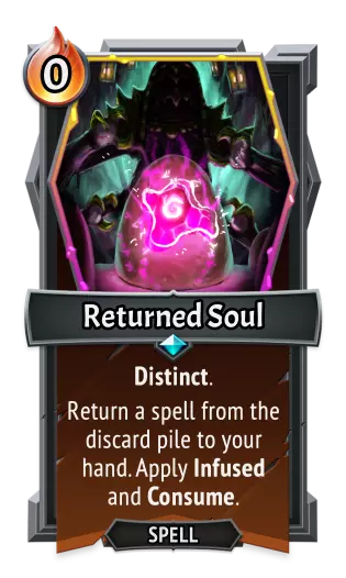 | | 《怪物火车》 | | 《怪物火车2》 | | ---- | ---- | ---- | ---- | | 类型: | 法术 | 类型: | 法术 | | 效果: | 已协调。提取2。<br>对前方敌方单位造成50点伤害。 | 效果: | 已协调。提取2。<br>对前方敌方单位造成80点伤害。 | 归还之魂