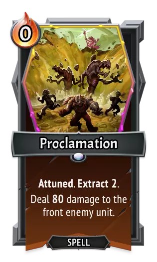 | | | | | | ---- | ---- | ---- | ---- | | **《怪物火车》** | | **《怪物火车2》** | | | 类型: | 法术 | 类型: | 法术 | | 效果: | 每消耗1个法术,造成15点伤害。 | 效果: | 每消耗1个法术,造成20点伤害。 | Proclamation