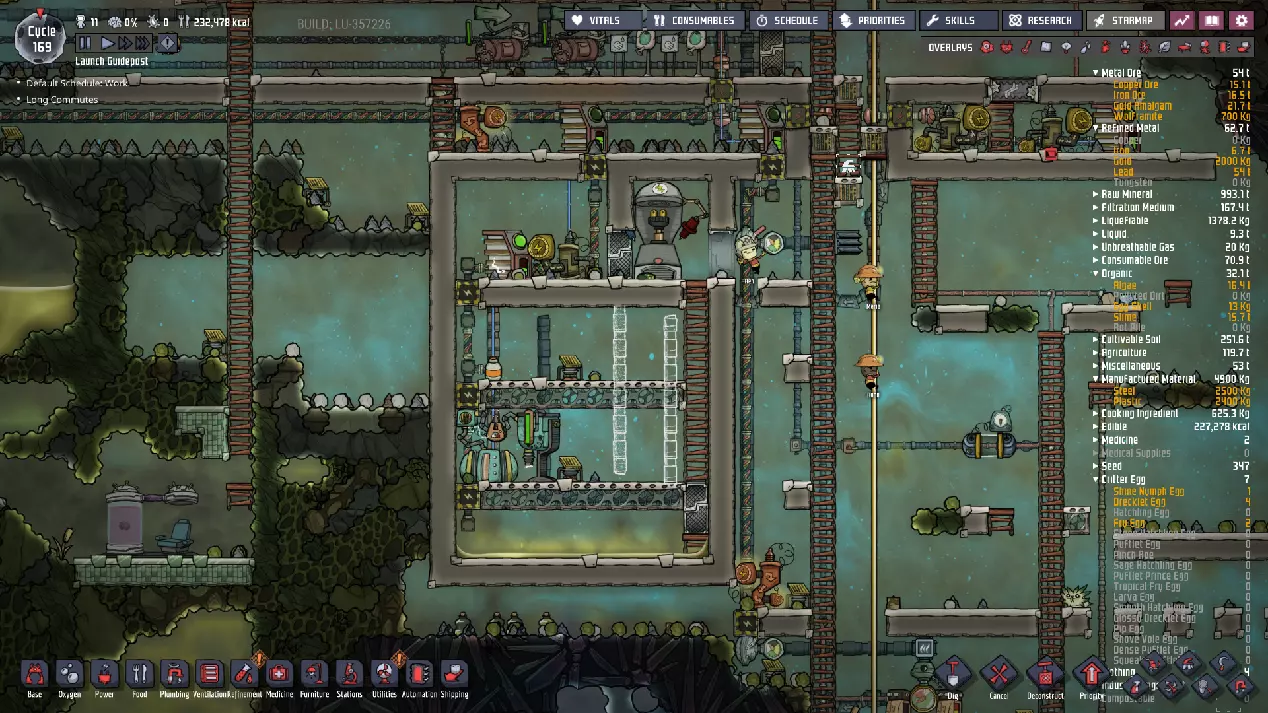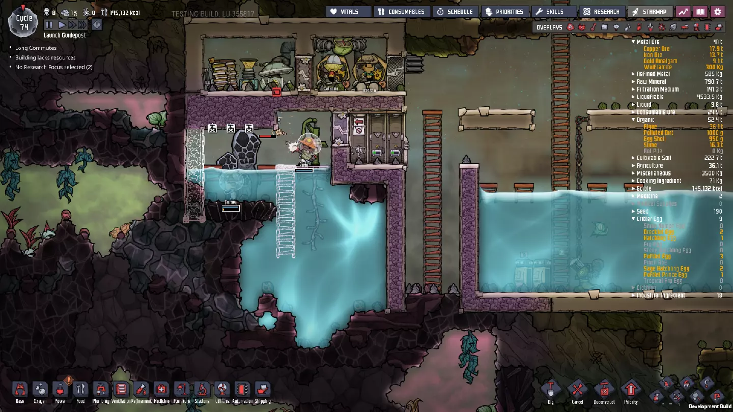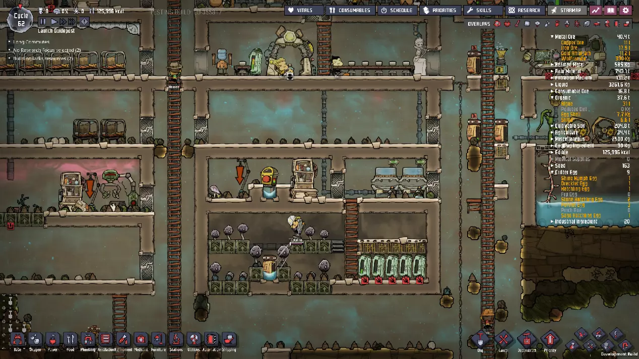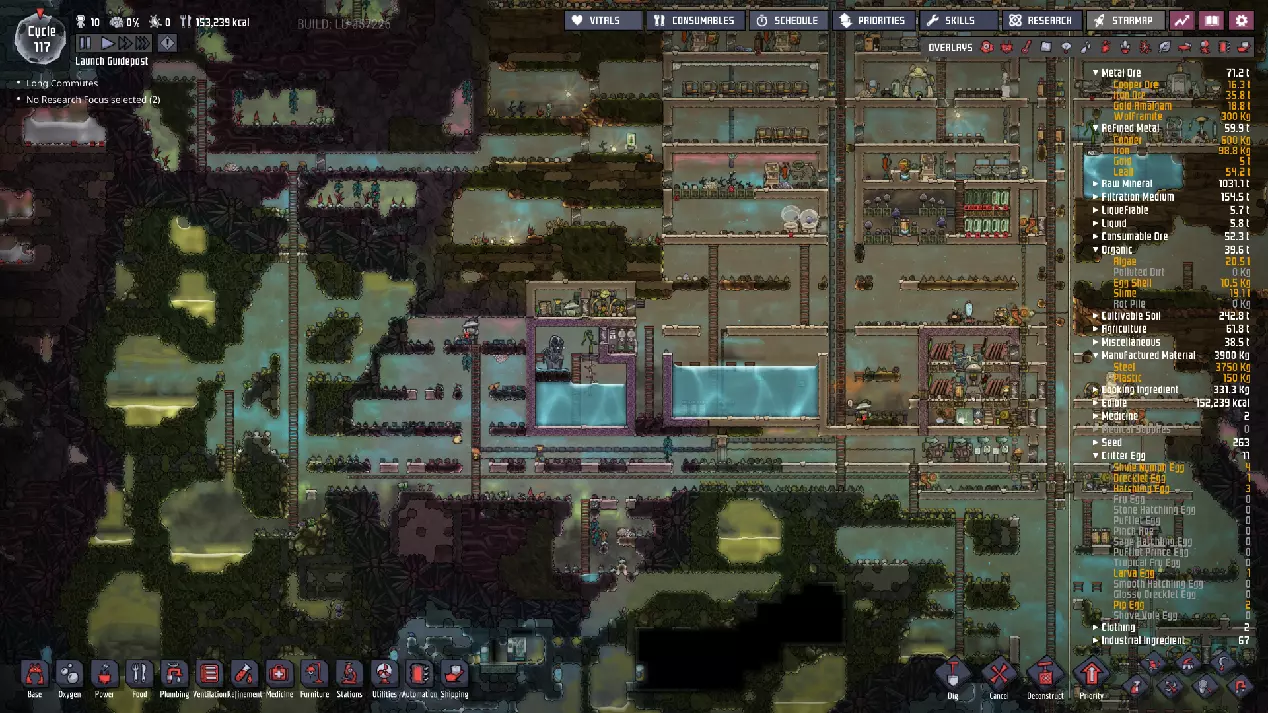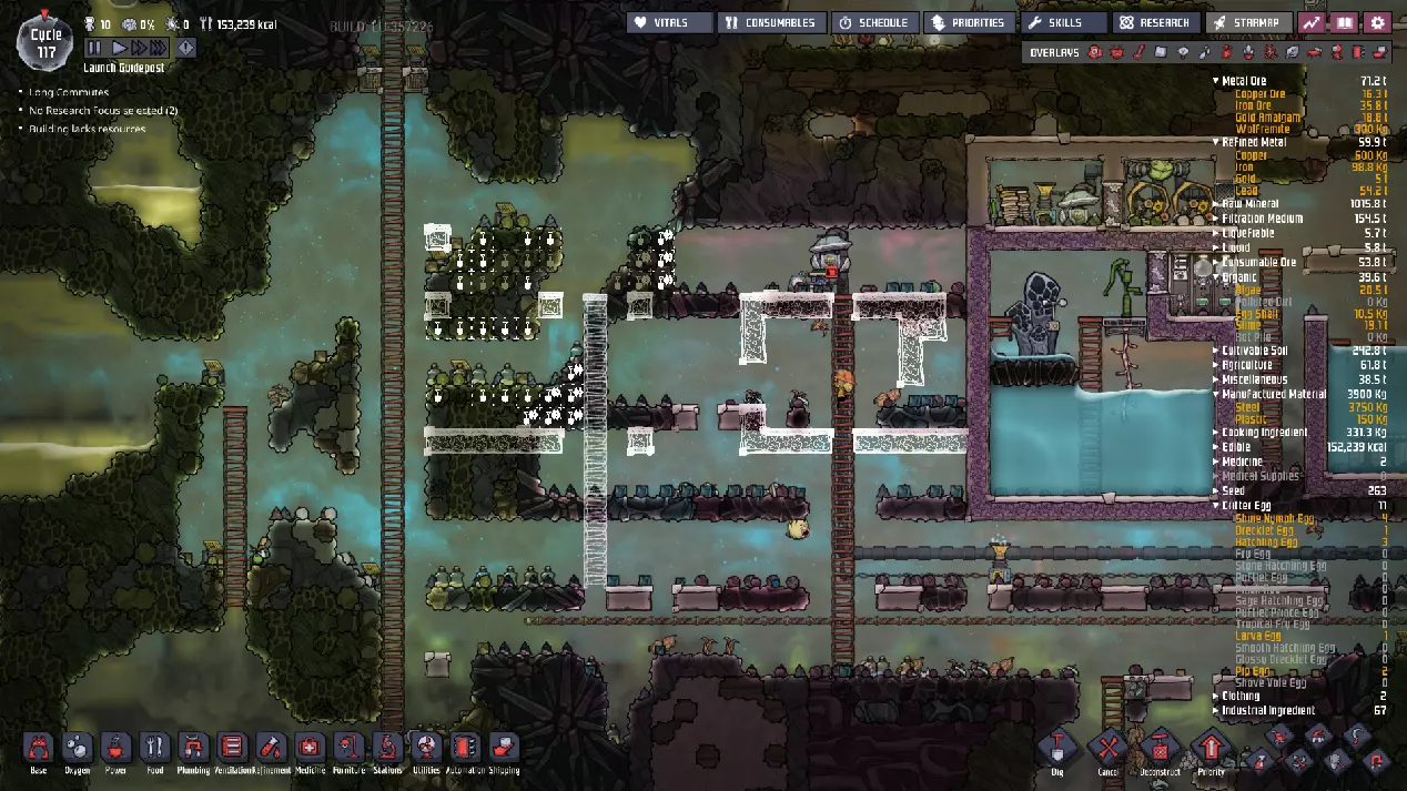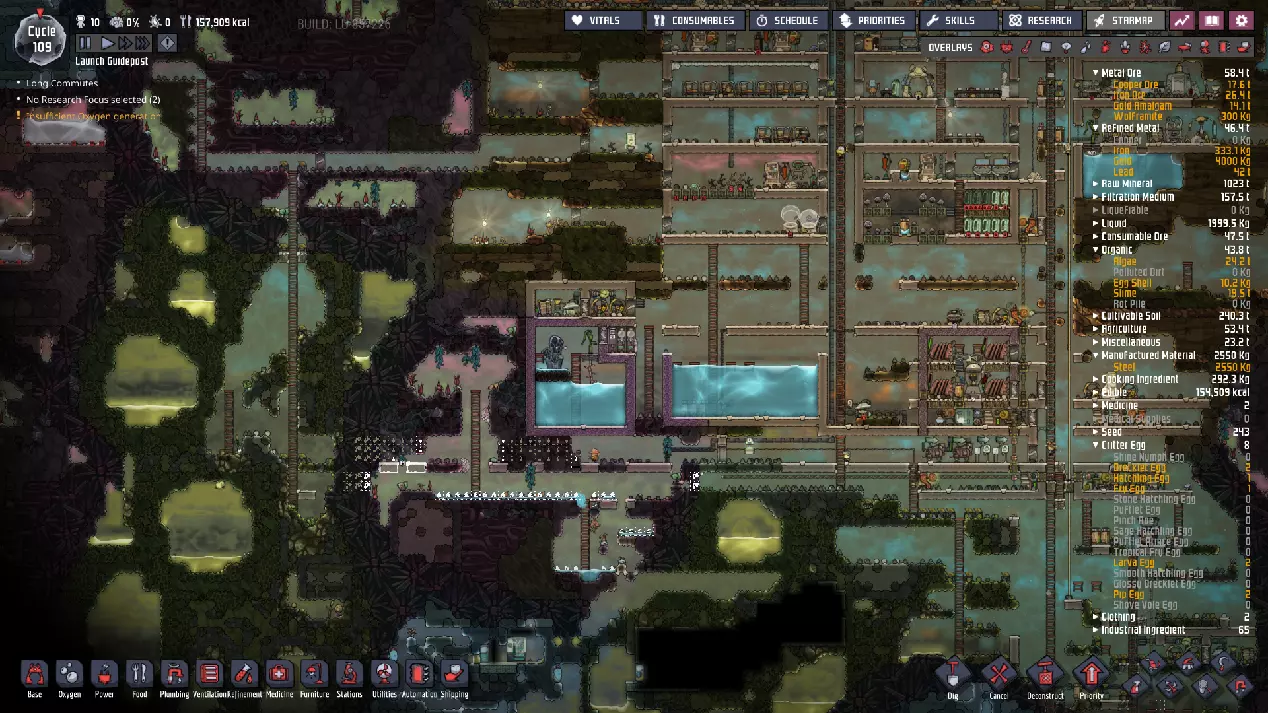 这与我的早期游戏指南结尾处的殖民地完全相同,这意味着已达成以下目标: - 已建立基础的食用树农场,并且我们的产量足以从 lice 面包转向腌菜。 - 复制人已开始获得专业技能,并且拥有足够的士气来学习技能而不会产生压力。 - 管道系统和基础水循环系统已就位。 - 已建立基于煤炭的发电系统。 - 已建立初始的碳洗涤器系统。 通过达成这些目标,殖民地已变得相对稳定,并满足了复制人的所有基本需求。因此,我们现在可以将时间花在更大的项目和探索上。基本上,我们已从“生存”阶段主要转向“扩张”阶段。尽管如此,我们仍然面临一些持续存在的问题: - 虽然我们的水资源供应充足,但它也是相当有限的。过多的研究将大幅消耗我们的储备,所以要小心! - 我们仍在通过藻类生产氧气。我们的初始区域藻类数量有限,因此我们要么需要持续开采更多藻类,要么需要找到某种方法过渡到基于水的氧气生产。 简而言之,我们目前最大的担忧是水资源,不过随着游戏进程,热量也将开始成为一个需要关注的问题。 其他注意事项: 如果你还没有这样做,或许可以在“优先级”选项卡上勾选“启用接近度”框。这是为了帮助大型基地更高效地进行任务选择,而且由于我们很快就要开始探索,复制人(Dupe)的移动时间也会增加,所以现在正是进行这项优化的好时机。