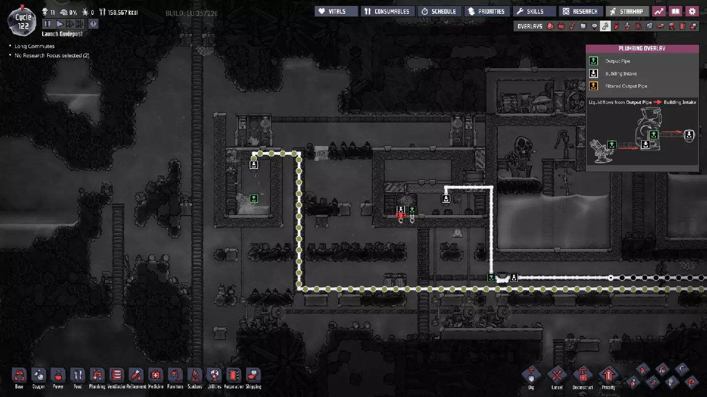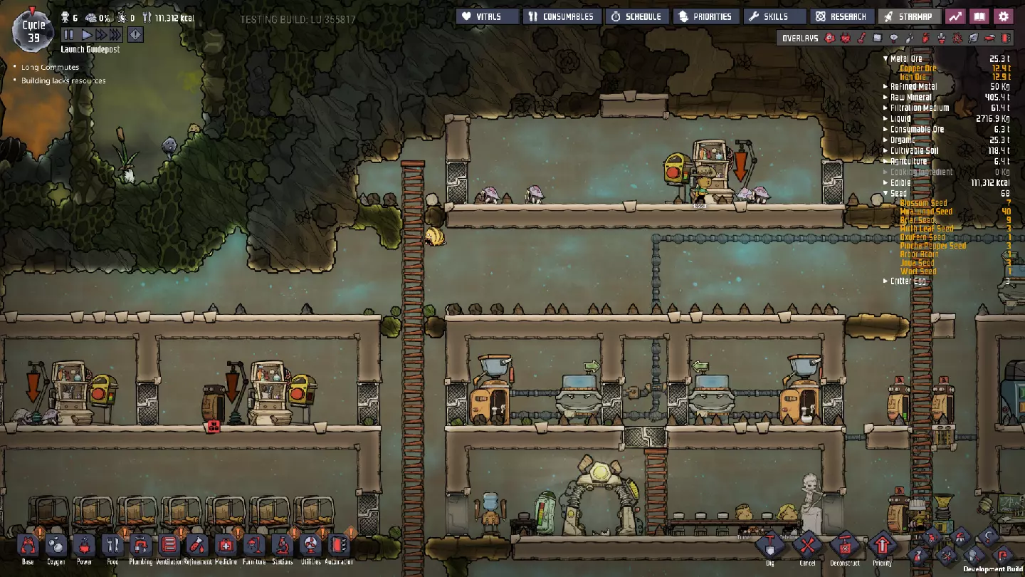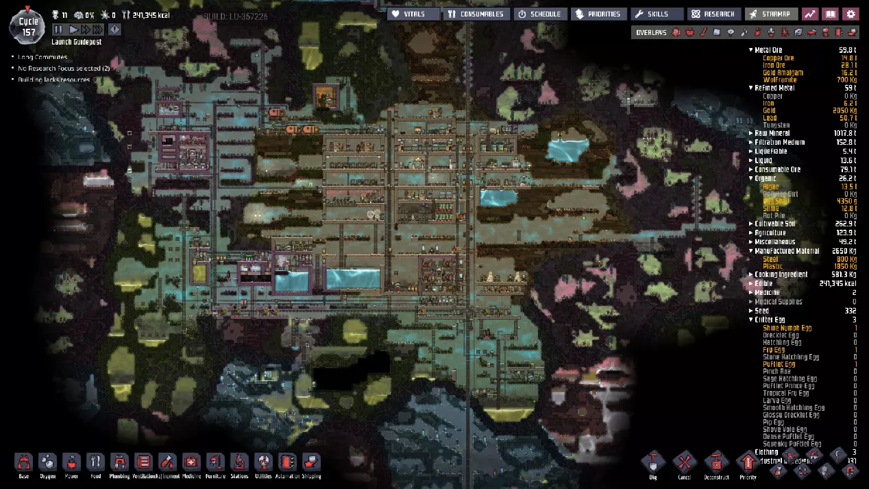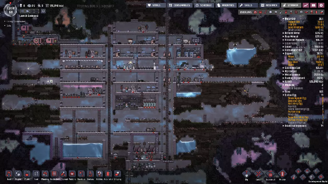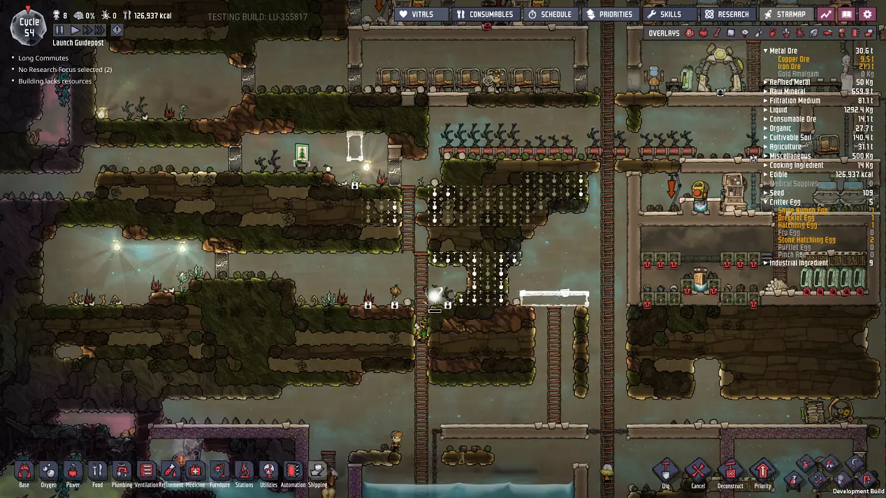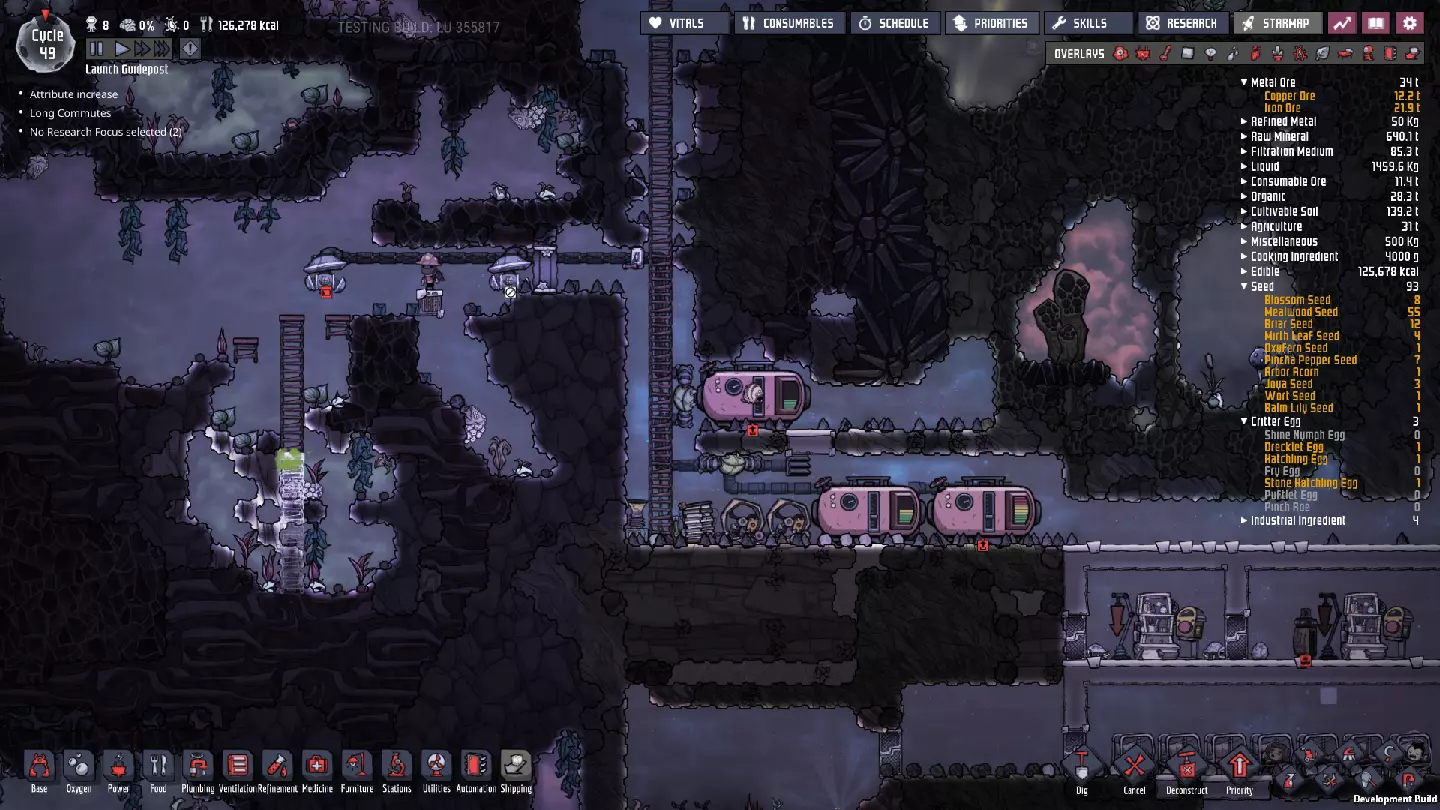 这与我的早期游戏指南结尾处的殖民地完全相同,这意味着已达成以下目标: - 已建立基础的食用树农场,并且我们的产量足以从 lice 面包转向腌菜。 - 复制人已开始获得专业技能,并且拥有足够的士气来学习技能而不会产生压力。 - 管道系统和基础水循环系统已就位。 - 已建立基于煤炭的发电系统。 - 已建立初始的碳洗涤器系统。 通过达成这些目标,殖民地已变得相对稳定,并满足了复制人的所有基本需求。因此,我们现在可以将时间花在更大的项目和探索上。基本上,我们已从“生存”阶段主要转向“扩张”阶段。尽管如此,我们仍然面临一些持续存在的问题: - 虽然我们的水资源供应充足,但它也是相当有限的。过多的研究将大幅消耗我们的储备,所以要小心! - 我们仍在通过藻类生产氧气。我们的初始区域藻类数量有限,因此我们要么需要持续开采更多藻类,要么需要找到某种方法过渡到基于水的氧气生产。 简而言之,我们目前最大的担忧是水资源,不过随着游戏进程,热量也将开始成为一个需要关注的问题。 其他注意事项: 如果你还没有这样做,或许可以在“优先级”选项卡上勾选“启用接近度”框。这是为了帮助大型基地更高效地进行任务选择,而且由于我们很快就要开始探索,复制人(Dupe)的移动时间也会增加,所以现在正是进行这项优化的好时机。