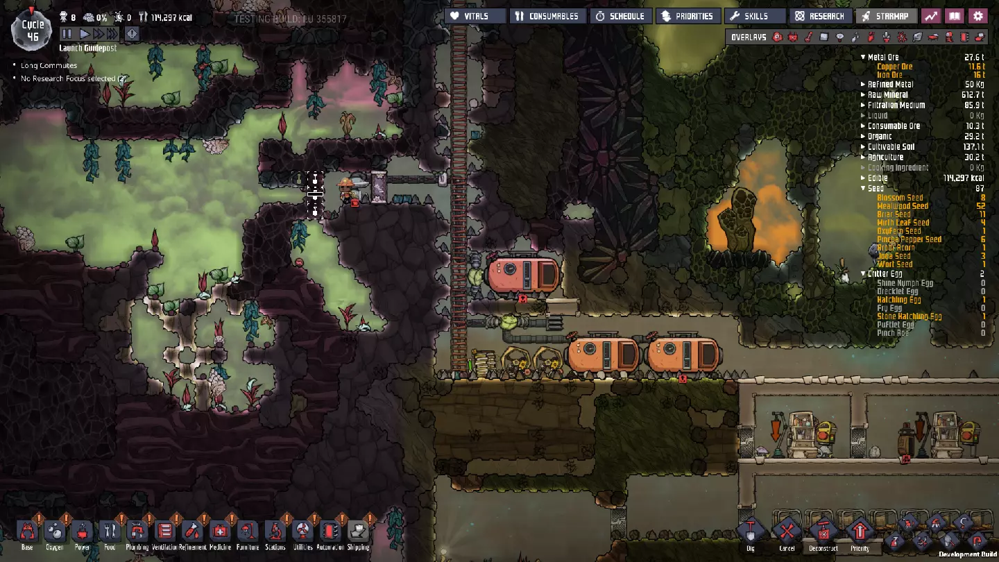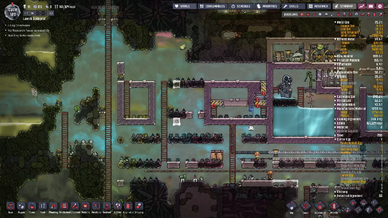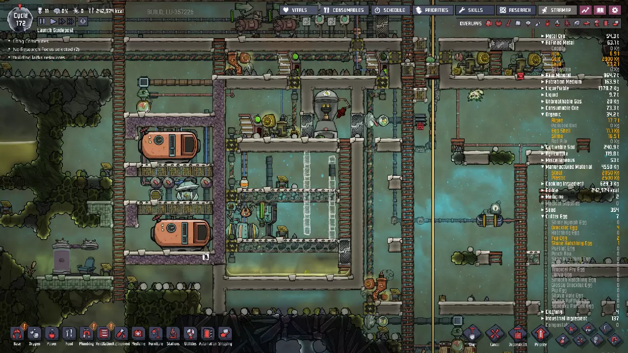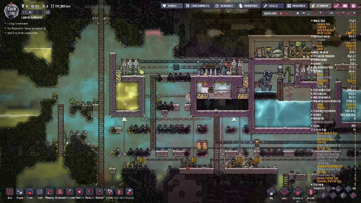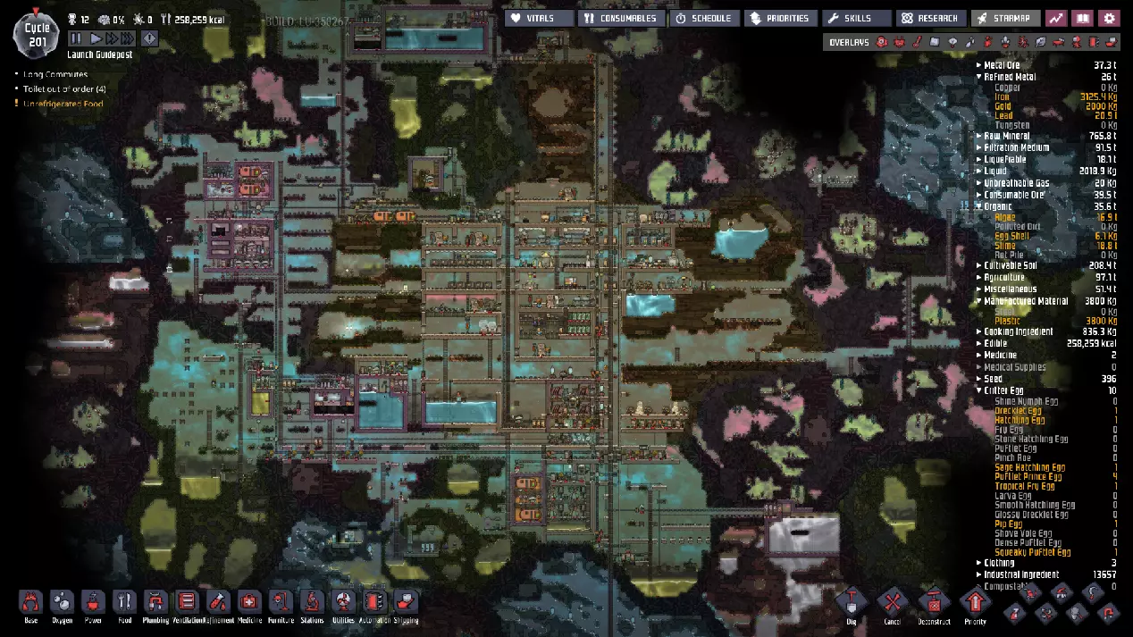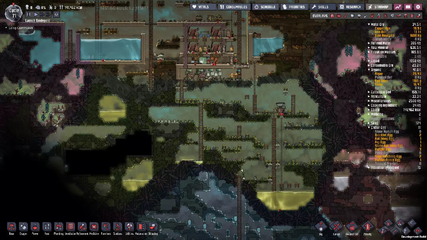 这与我的早期游戏指南结尾处的殖民地完全相同,这意味着已达成以下目标: - 已建立基础的食用树农场,并且我们的产量足以从 lice 面包转向腌菜。 - 复制人已开始获得专业技能,并且拥有足够的士气来学习技能而不会产生压力。 - 管道系统和基础水循环系统已就位。 - 已建立基于煤炭的发电系统。 - 已建立初始的碳洗涤器系统。 通过达成这些目标,殖民地已变得相对稳定,并满足了复制人的所有基本需求。因此,我们现在可以将时间花在更大的项目和探索上。基本上,我们已从“生存”阶段主要转向“扩张”阶段。尽管如此,我们仍然面临一些持续存在的问题: - 虽然我们的水资源供应充足,但它也是相当有限的。过多的研究将大幅消耗我们的储备,所以要小心! - 我们仍在通过藻类生产氧气。我们的初始区域藻类数量有限,因此我们要么需要持续开采更多藻类,要么需要找到某种方法过渡到基于水的氧气生产。 简而言之,我们目前最大的担忧是水资源,不过随着游戏进程,热量也将开始成为一个需要关注的问题。 其他注意事项: 如果你还没有这样做,或许可以在“优先级”选项卡上勾选“启用接近度”框。这是为了帮助大型基地更高效地进行任务选择,而且由于我们很快就要开始探索,复制人(Dupe)的移动时间也会增加,所以现在正是进行这项优化的好时机。