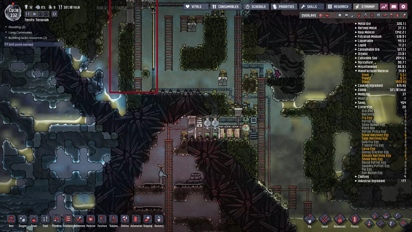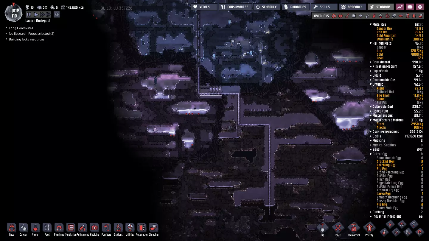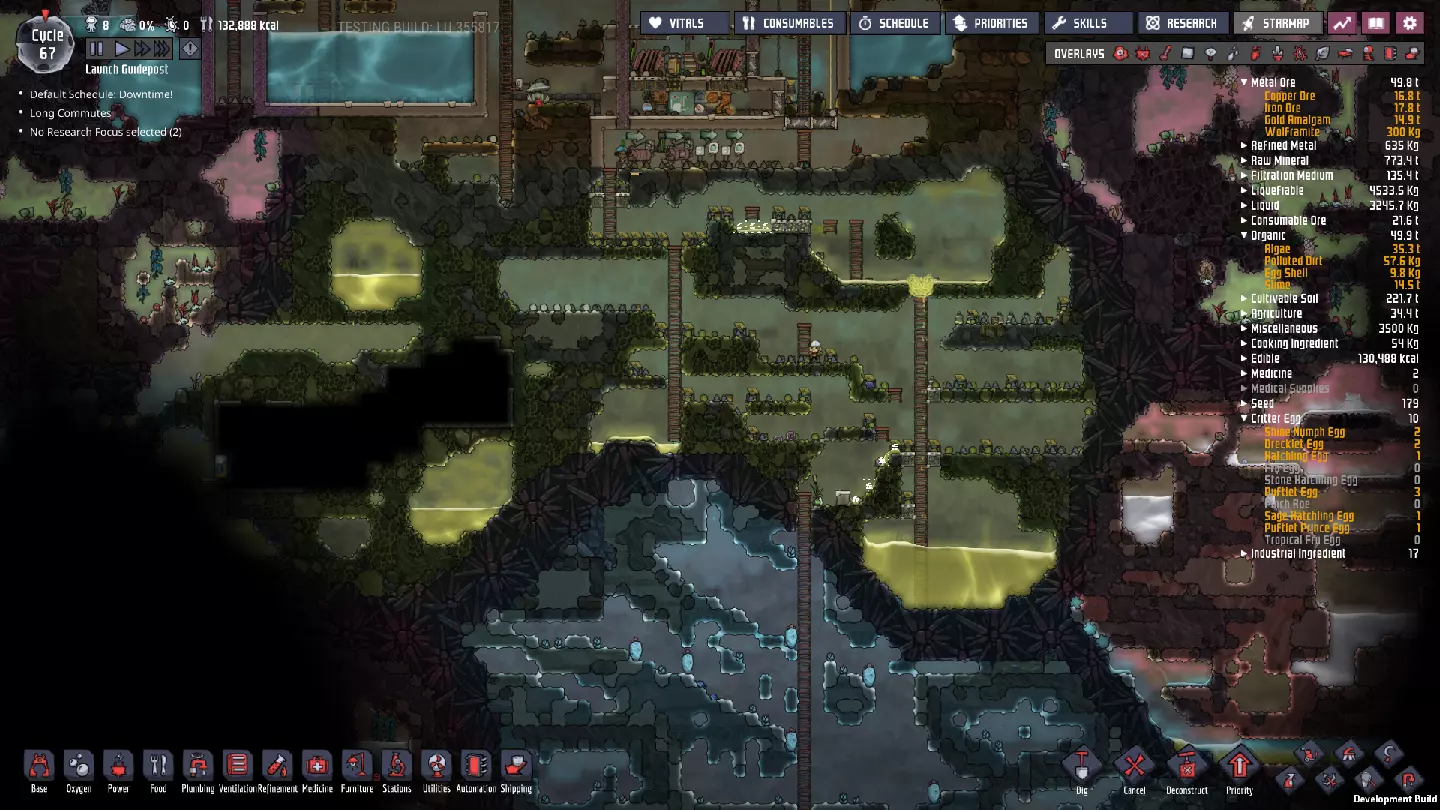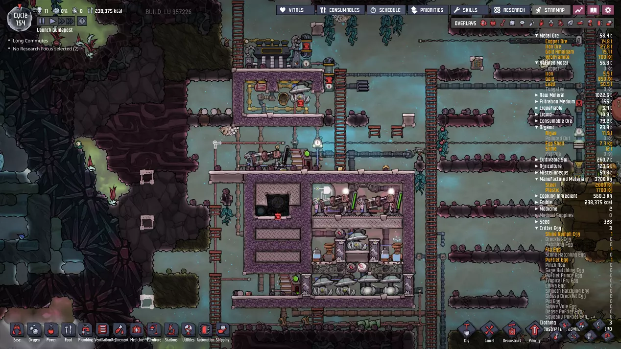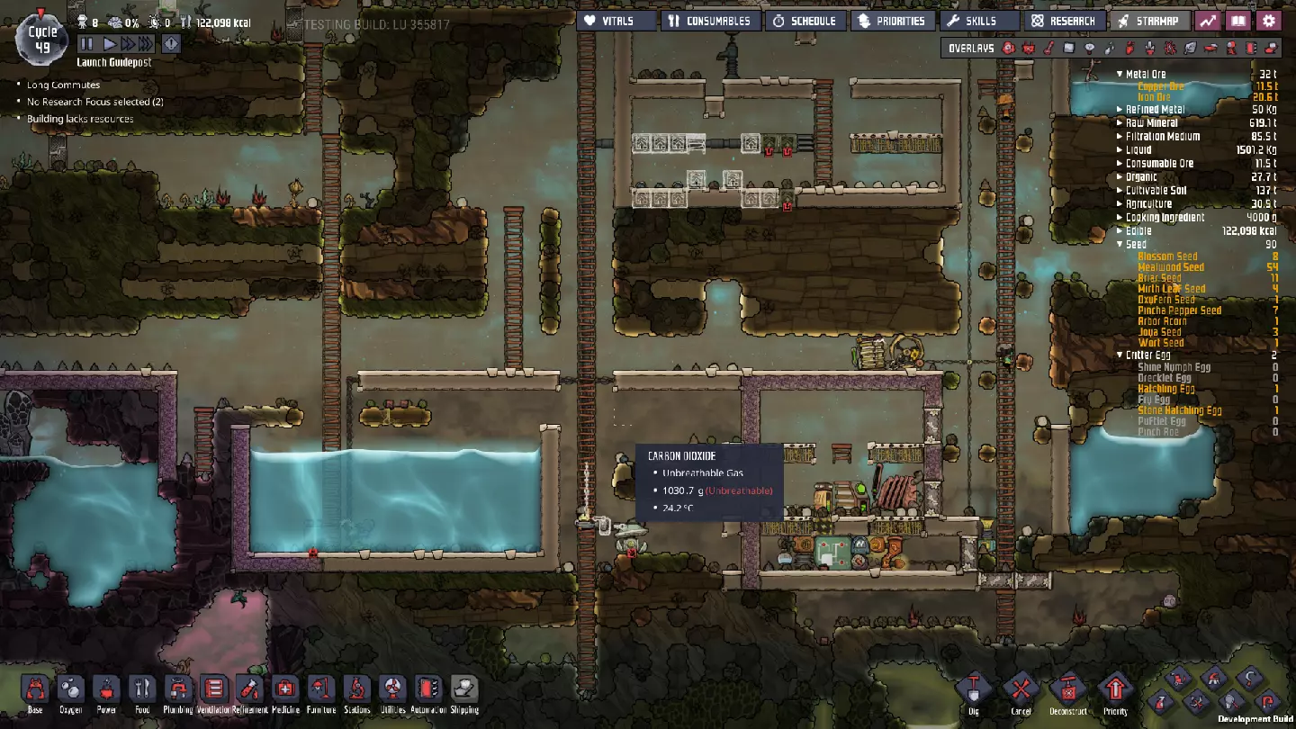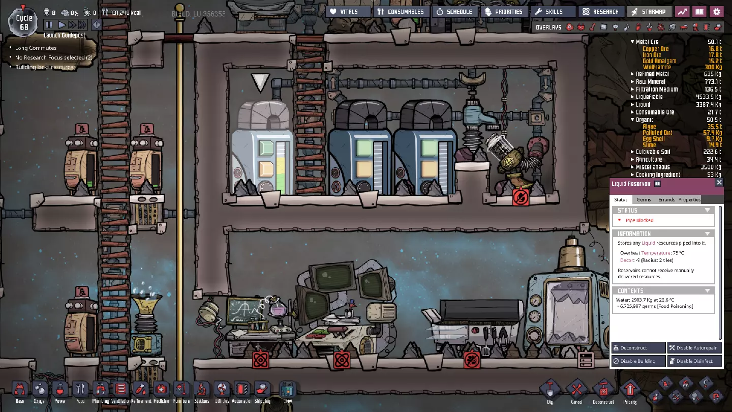 这与我的早期游戏指南结尾处的殖民地完全相同,这意味着已达成以下目标: - 已建立基础的食用树农场,并且我们的产量足以从 lice 面包转向腌菜。 - 复制人已开始获得专业技能,并且拥有足够的士气来学习技能而不会产生压力。 - 管道系统和基础水循环系统已就位。 - 已建立基于煤炭的发电系统。 - 已建立初始的碳洗涤器系统。 通过达成这些目标,殖民地已变得相对稳定,并满足了复制人的所有基本需求。因此,我们现在可以将时间花在更大的项目和探索上。基本上,我们已从“生存”阶段主要转向“扩张”阶段。尽管如此,我们仍然面临一些持续存在的问题: - 虽然我们的水资源供应充足,但它也是相当有限的。过多的研究将大幅消耗我们的储备,所以要小心! - 我们仍在通过藻类生产氧气。我们的初始区域藻类数量有限,因此我们要么需要持续开采更多藻类,要么需要找到某种方法过渡到基于水的氧气生产。 简而言之,我们目前最大的担忧是水资源,不过随着游戏进程,热量也将开始成为一个需要关注的问题。 其他注意事项: 如果你还没有这样做,或许可以在“优先级”选项卡上勾选“启用接近度”框。这是为了帮助大型基地更高效地进行任务选择,而且由于我们很快就要开始探索,复制人(Dupe)的移动时间也会增加,所以现在正是进行这项优化的好时机。