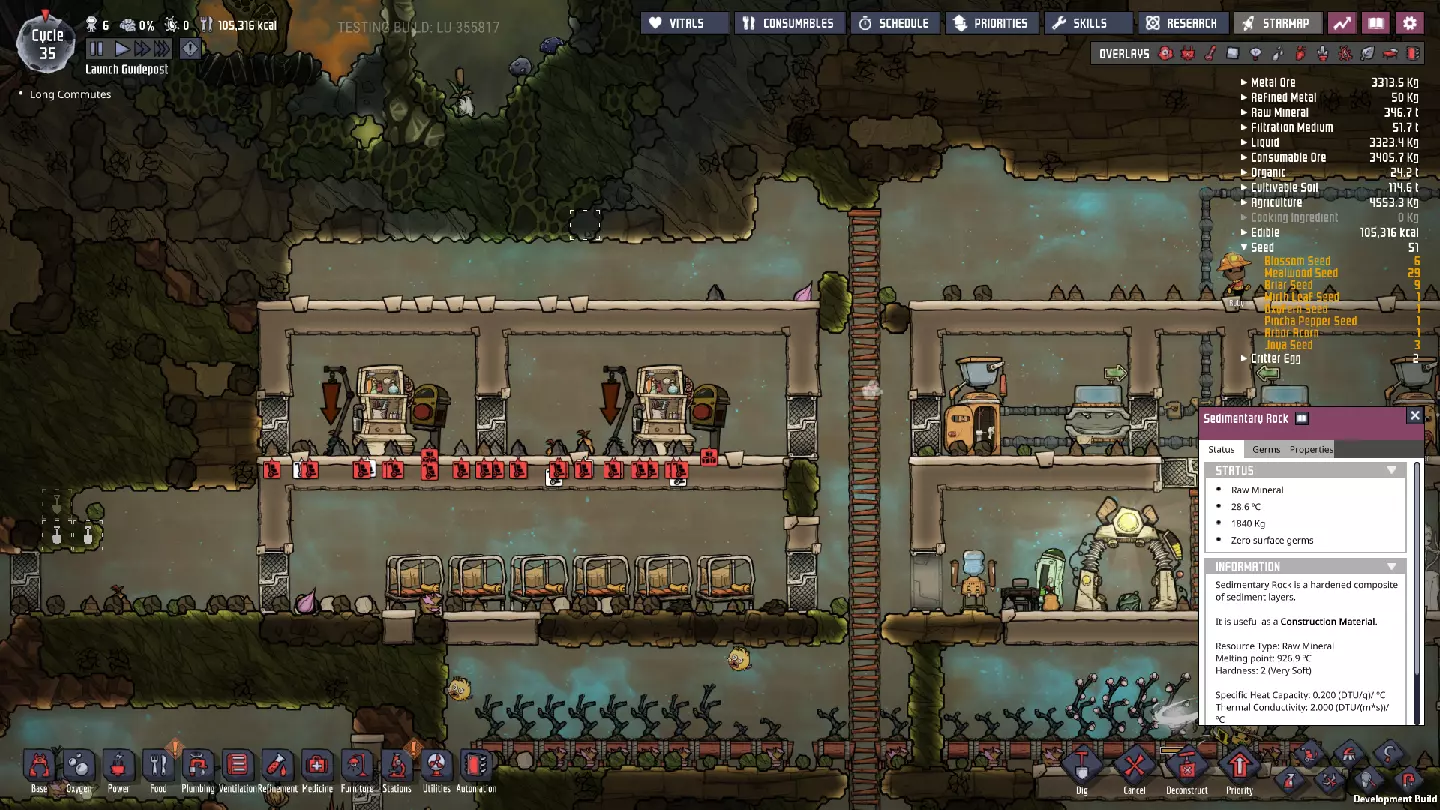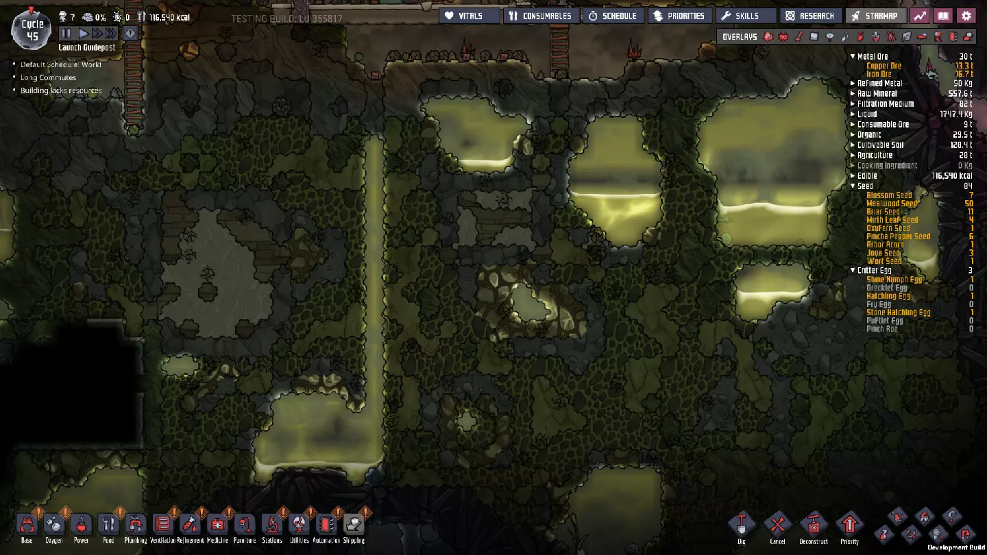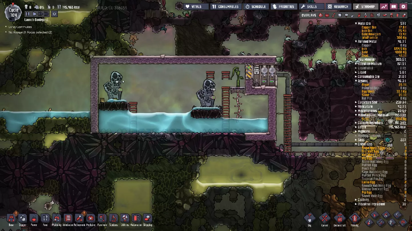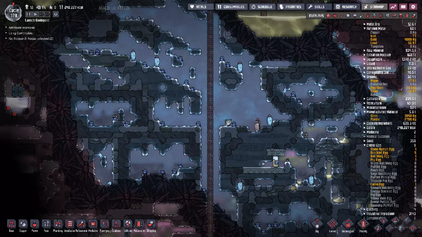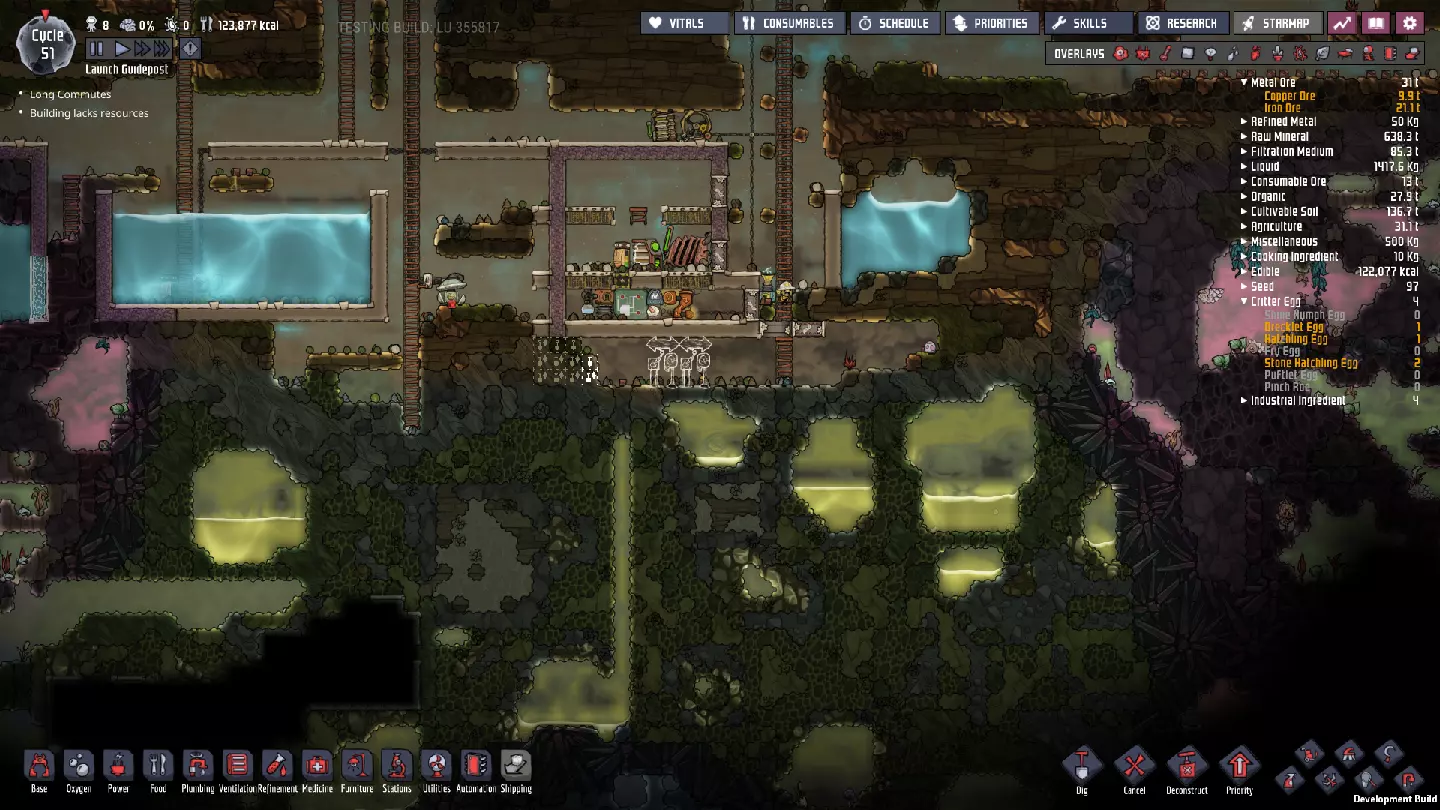 这与我的早期游戏指南结尾处的殖民地完全相同,这意味着已达成以下目标: - 已建立基础的食用树农场,并且我们的产量足以从 lice 面包转向腌菜。 - 复制人已开始获得专业技能,并且拥有足够的士气来学习技能而不会产生压力。 - 管道系统和基础水循环系统已就位。 - 已建立基于煤炭的发电系统。 - 已建立初始的碳洗涤器系统。 通过达成这些目标,殖民地已变得相对稳定,并满足了复制人的所有基本需求。因此,我们现在可以将时间花在更大的项目和探索上。基本上,我们已从“生存”阶段主要转向“扩张”阶段。尽管如此,我们仍然面临一些持续存在的问题: - 虽然我们的水资源供应充足,但它也是相当有限的。过多的研究将大幅消耗我们的储备,所以要小心! - 我们仍在通过藻类生产氧气。我们的初始区域藻类数量有限,因此我们要么需要持续开采更多藻类,要么需要找到某种方法过渡到基于水的氧气生产。 简而言之,我们目前最大的担忧是水资源,不过随着游戏进程,热量也将开始成为一个需要关注的问题。 其他注意事项: 如果你还没有这样做,或许可以在“优先级”选项卡上勾选“启用接近度”框。这是为了帮助大型基地更高效地进行任务选择,而且由于我们很快就要开始探索,复制人(Dupe)的移动时间也会增加,所以现在正是进行这项优化的好时机。